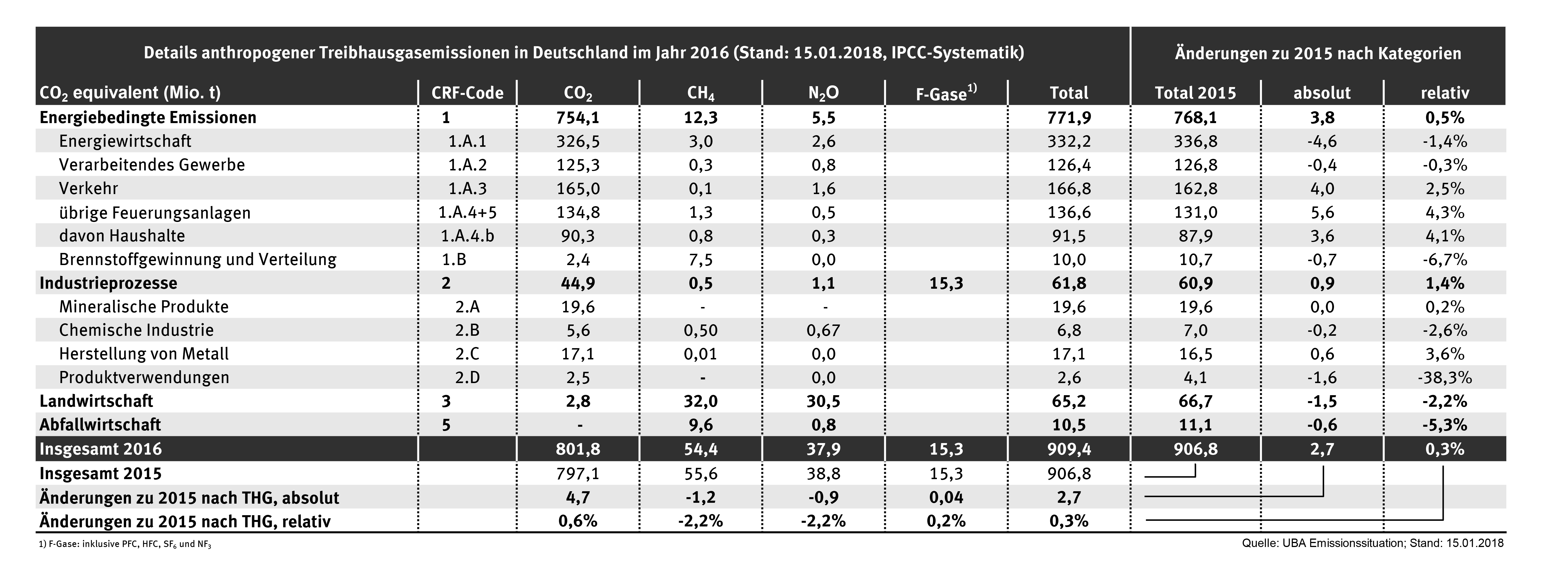 In der Landwirtschaft sanken 2016 die Emissionen leicht gegenüber dem Vorjahr auf 65,2 Millionen Tonnen; ausschlaggebend ist ein geringerer Einsatz von mineralischen Düngern. Dagegen sind die Emissionen in der Industrie leicht um 1,4 Prozent angestiegen, insbesondere durch die Zunahme in der Metallindustrie.