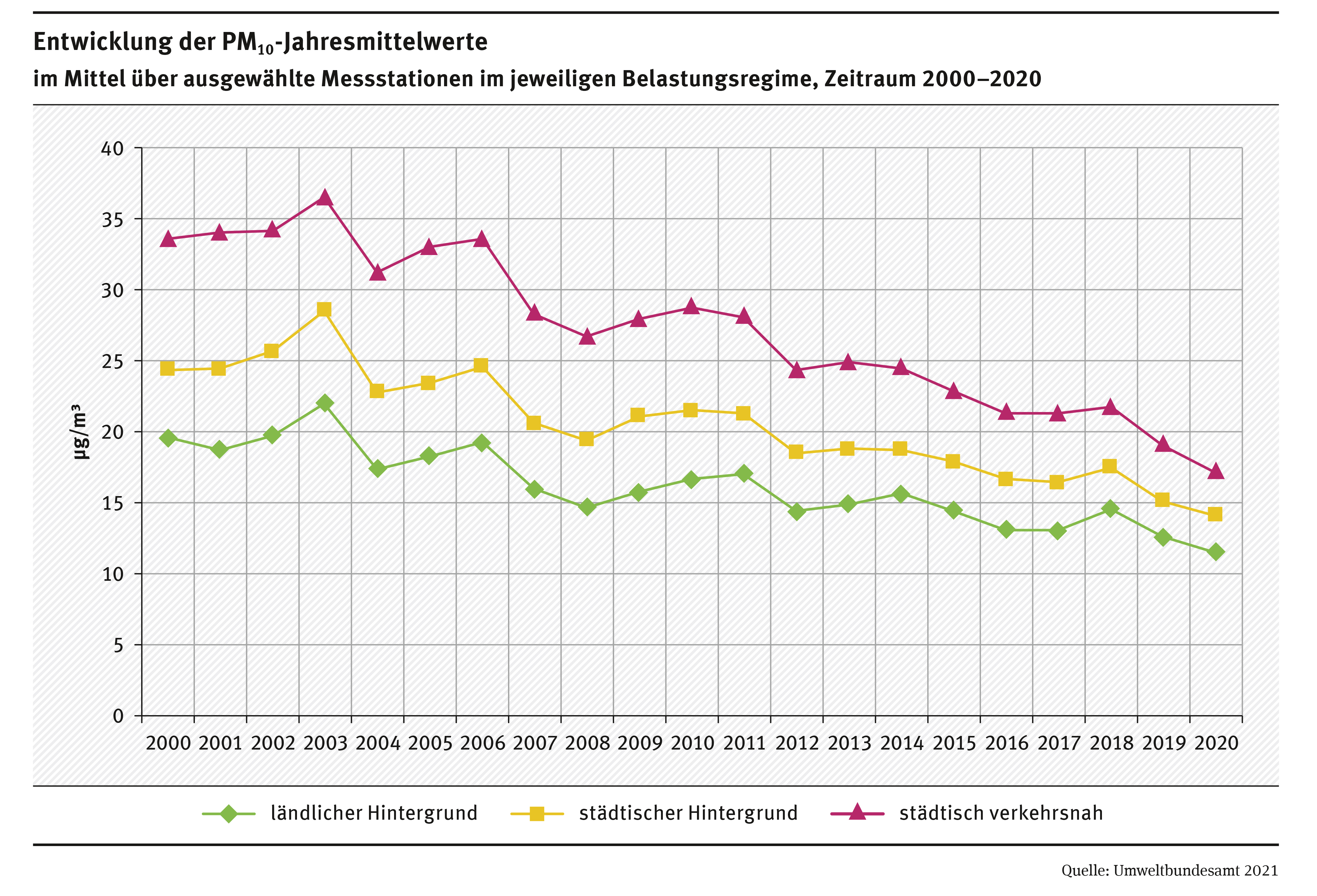Feinstaub: 2020 war das am geringsten mit Feinstaub belastete Jahr seit Beginn der Feinstaubmessungen Ende der 1990er Jahre. Die Feinstaubgrenzwerte für PM10 und PM2,5 wurden deutschlandweit eingehalten. Die Grenzwerte für Feinstaub sind jedoch mehr als 20 Jahre alt und bedürfen einer Anpassung an die neuesten wissenschaftlichen Erkenntnisse der Weltgesundheitsorganisation (WHO), die aktuell gerade ihre Empfehlungen erneut überarbeitet und einem verbesserten Gesundheitsschutz anpassen wird. Aktuell empfiehlt die WHO, dass die PM10-Konzentrationen den Wert von 20 µg/m3 im Jahresmittel nicht überschreiten sollen. An etwa vier Prozent (2019: 13 Prozent) aller Messstationen wurde dieser Empfehlung 2020 nicht entsprochen. Die Empfehlung der WHO in Bezug auf die Tagesmittelwerte (höchstens drei Tage pro Jahr über 50 µg/m³ im Tagesmittel) hielten rund 12 Prozent (2019: 36 Prozent) aller Messstationen in Deutschland nicht ein. Die WHO-Empfehlungen für die noch kleineren Partikel PM2,5 wurden im Jahr 2020 noch deutlicher als die für PM10 überschritten: An 86 Prozent aller Stationen lagen die PM2,5-Tagesmittelwerte an mehr als 3 Tagen über der Schwelle von 25 µg/m³, und an 11 Prozent über der Schwelle von 10 µg/m³ für das Jahresmittel. Der EU-weite Grenzwert liegt bei 25 µg/m³.