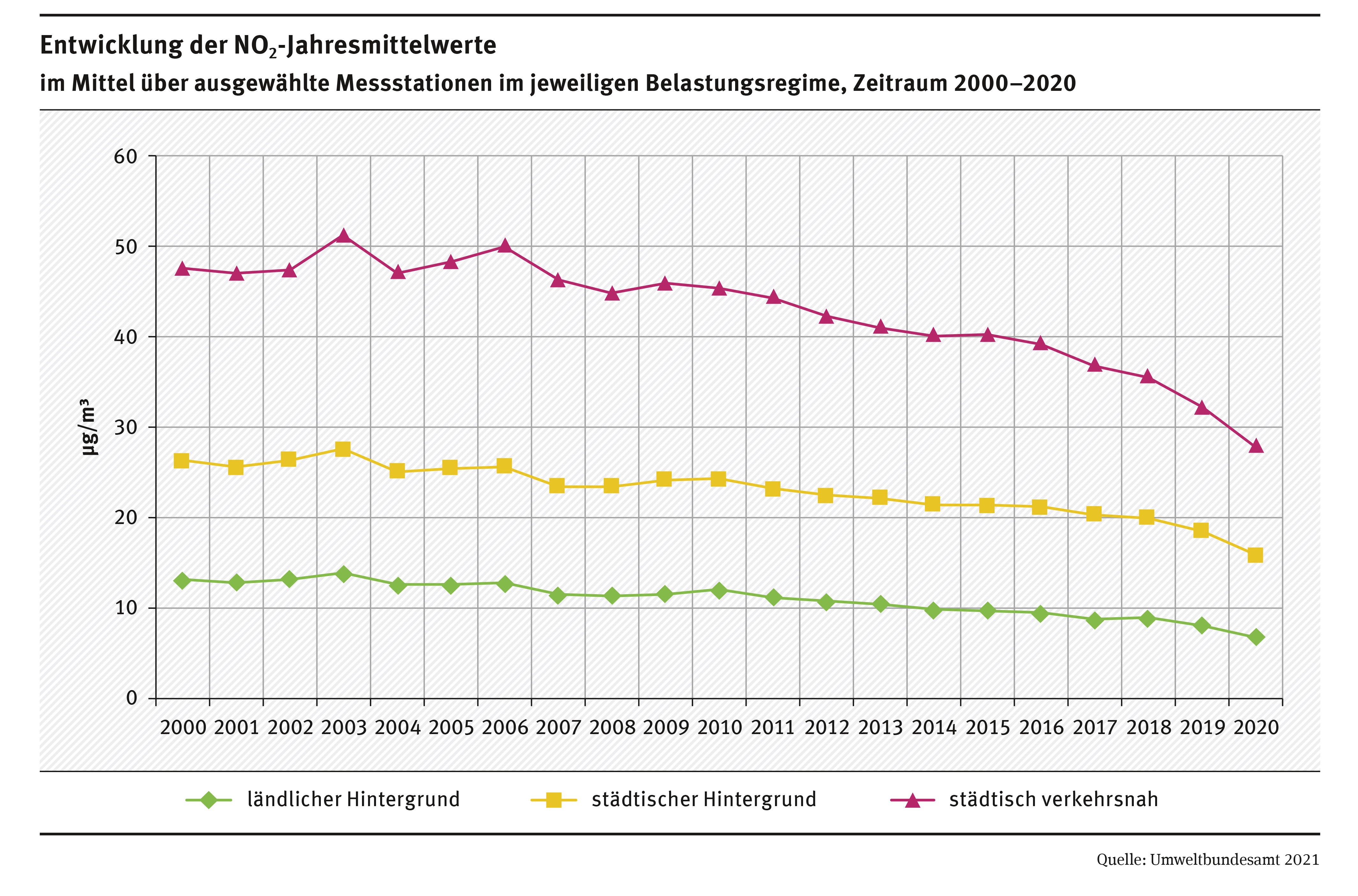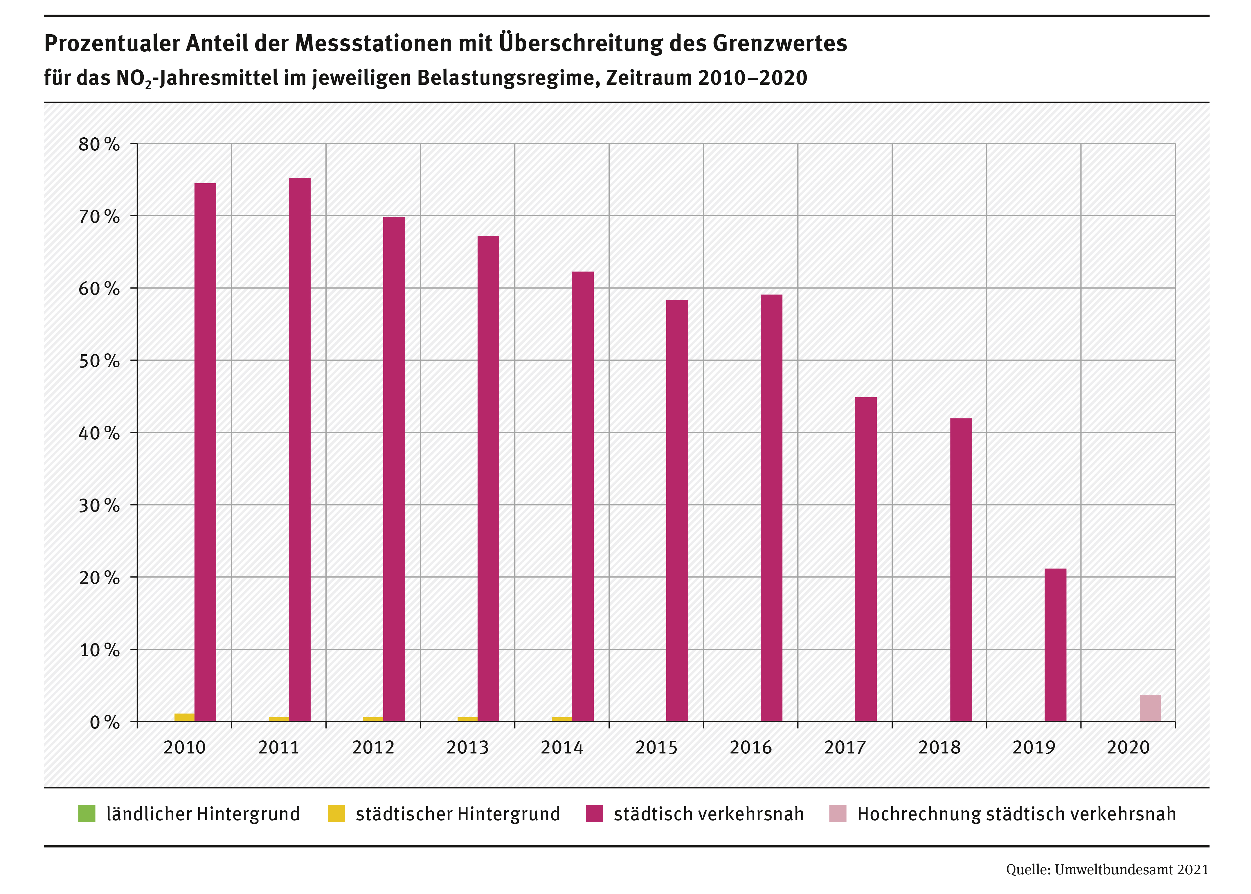 Waren im Jahr 2019 noch 25 Städte von der Überschreitung des NO2-Grenzwertes betroffen, so werden es 2020 deutlich weniger als zehn sein. Nach Auswertung der bereits jetzt vorliegenden Daten der automatisch messenden Stationen liegen auf jeden Fall München und Hamburg über dem Grenzwert mit einem Jahresmittelwert von 54 bzw. 41 Mikrogramm NO2 pro Kubikmeter Luft. Nach Auswertung der Daten von ca. 140 Passivsammlern, die im Labor analysiert werden müssen und deren Ergebnisse erst im Mai vorliegen, sind jedoch Überschreitungen in weiteren Städten wie z. B. Stuttgart zu erwarten.