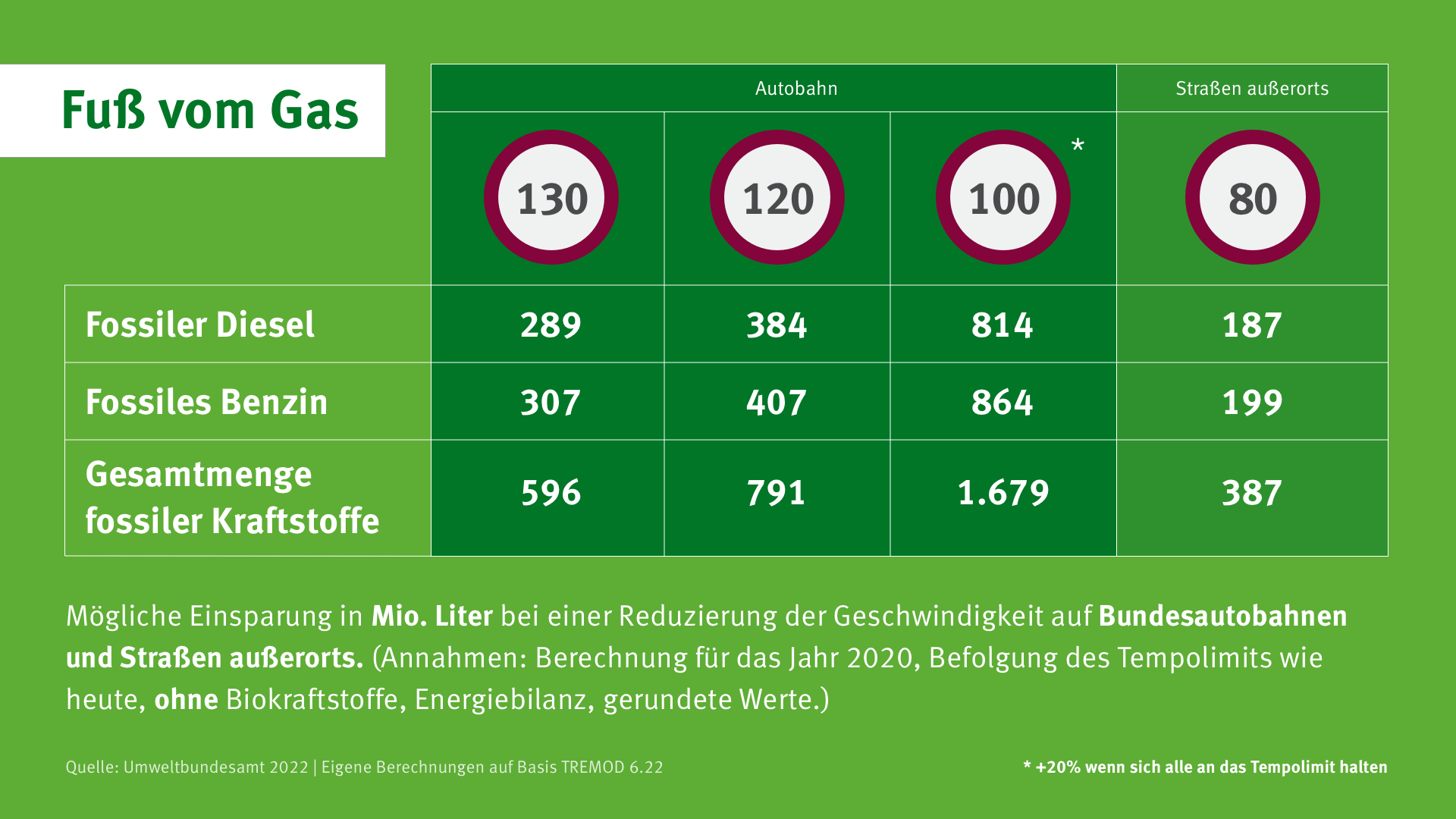 Reduzieren die Bürgerinnen und Bürger die Geschwindigkeit auf Autobahnen auf maximal 100 km/h und auf 80 km/h auf Straßen außerorts, spart das rund 2,1 Milliarden Liter fossilen Kraftstoff ein, selbst wenn man davon ausgeht, dass sich wie auch heute nicht alle an das Tempolimit halten und Einzelne schneller unterwegs sind. „Das spart immerhin sofort rund 3,8 Prozent des im Verkehrssektor verbrauchten Kraftstoffs. Würde man es schaffen, dass tatsächlich niemand mehr schneller unterwegs ist, fiele die Einsparung noch einmal rund 20 Prozent höher aus”, so Messner. Die Kosteneinsparung läge zwischen 3,5 Mrd. und 4,2 Mrd. Euro. Die Minderung läge bei aktueller Befolgung bei 5,3 Mio. Tonnen CO₂‑Äquivalenten und fällt aufgrund der Corona-bedingt reduzierten Fahrleistung damit geringer aus als noch 2020 berechnet.