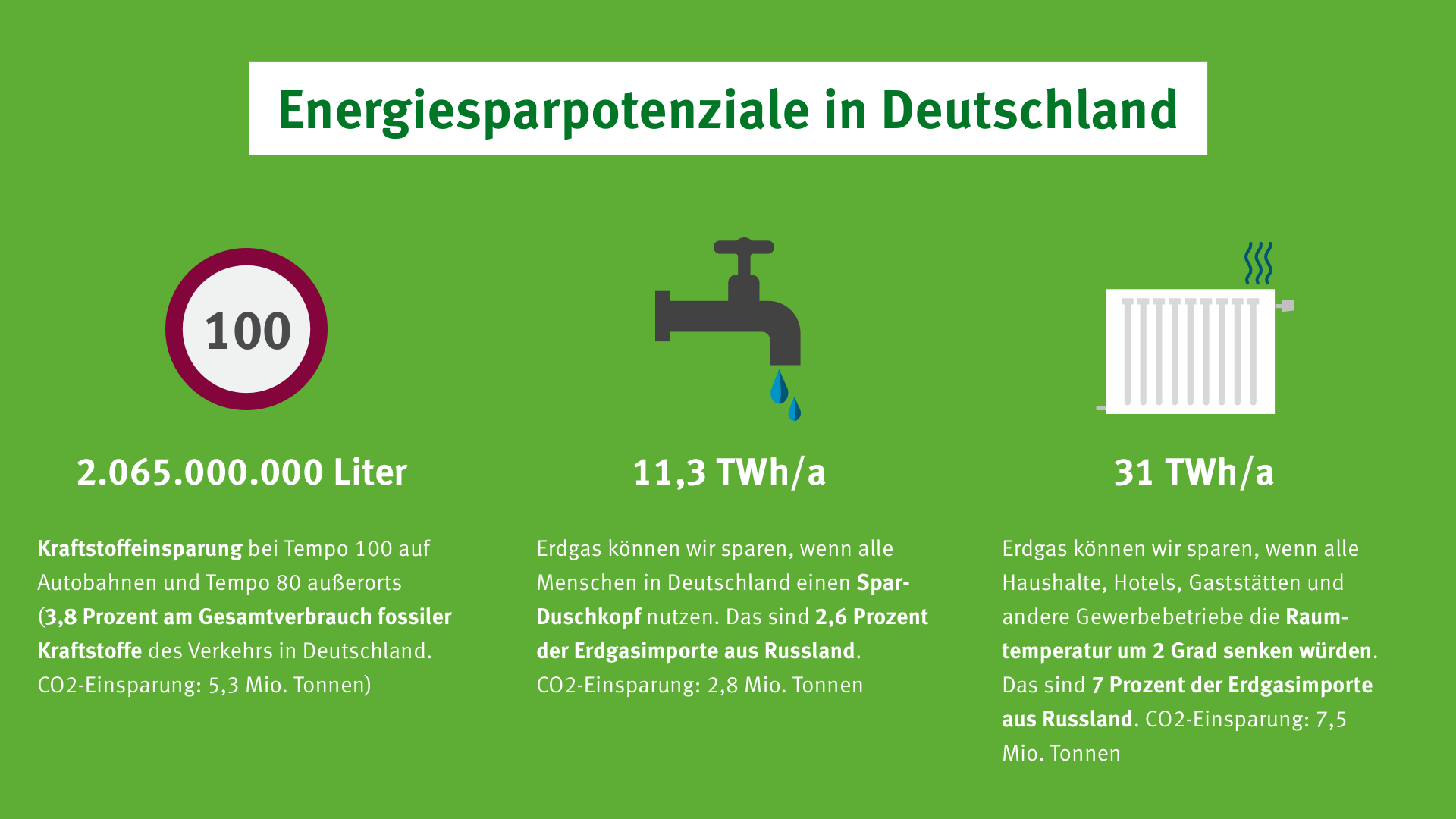 Das Umweltbundesamt (UBA) ruft angesichts des Krieges in der Ukraine dazu auf, mit Energie deutlich sparsamer umzugehen. UBA-Präsident Dirk Messner sagte: „Die beste Energie ist die, die gar nicht verbraucht wird. Das war schon immer richtig – und ist in der aktuellen Energiekrise noch wichtiger geworden. Private Haushalte können hier ganz einfach helfen: Die Heizung etwas runter drehen, einen wassersparenden Duschkopf einbauen und weniger und vor allem langsamer mit dem Auto fahren. All das lässt sich sofort umsetzen, kostet kein bis wenig Geld und entlastet auch die Haushaltskasse spürbar. Und wir werden deutlich unabhängiger von Rohstofflieferungen aus Russland. Um die Energiekrise zu bewerkstelligen sind natürlich auch langfristige Infrastrukturinvestitionen nötig. Aber auch wir Bürgerinnen und Bürger können unmittelbar handeln und sehr wirksam Energie sparen.“ Das UBA schätzt, dass durch eine um zwei Grad niedrigere Raumtemperatur in allen deutschen Wohn- und Nichtwohngebäuden sowie durch den Einbau von Spar-Duschköpfen rund zehn Prozent des russischen Erdgases einsparbar sind.
