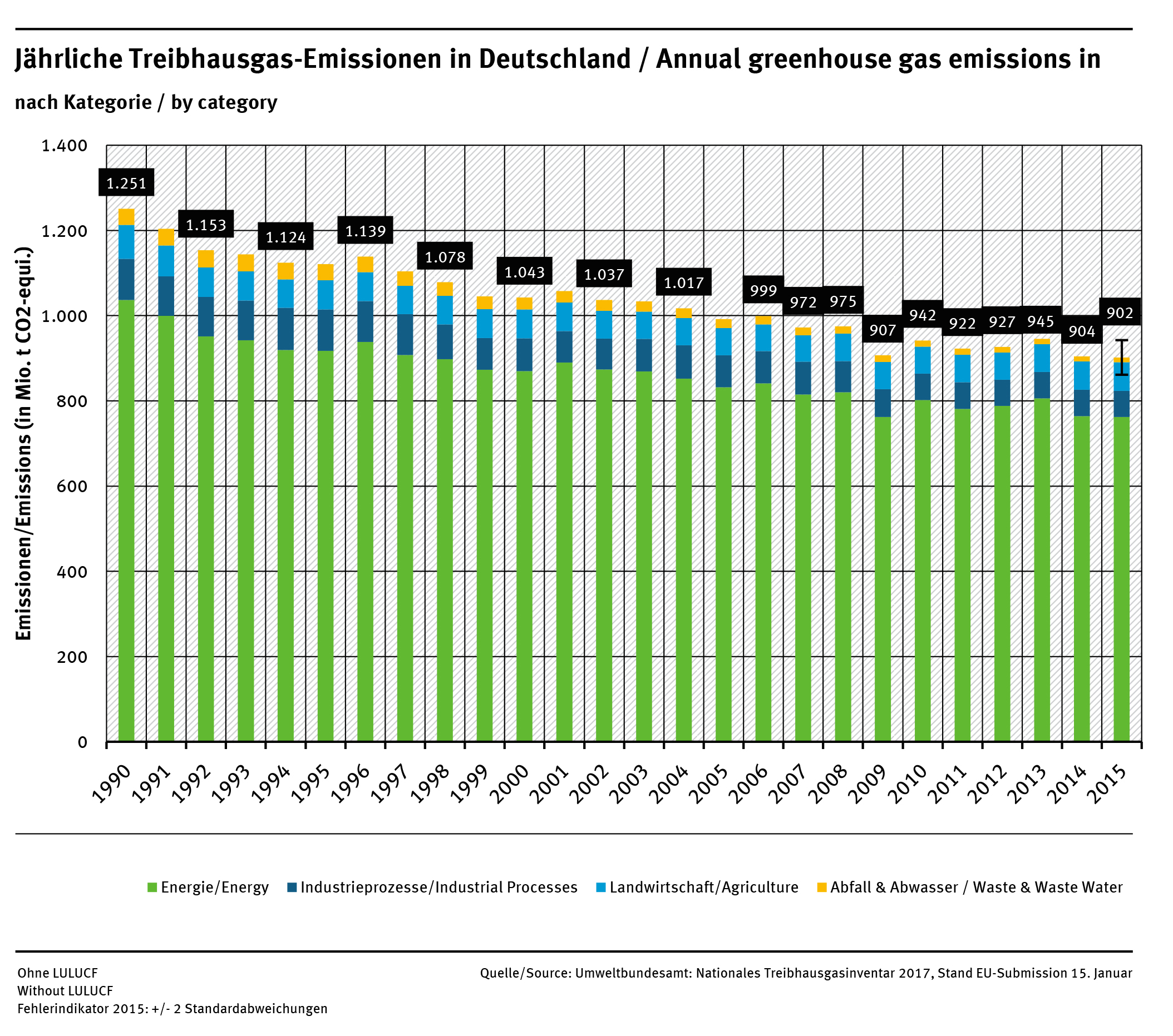 2015 wurden in Deutschland insgesamt 901,9 Millionen Tonnen CO2-Äquivalente ausgestoßen. Das sind 2,3 Millionen Tonnen bzw. 0,3 Prozent weniger als 2014 und 27,9 Prozent weniger im Vergleich zu 1990. Dies zeigen die Berechnungen, die das Umweltbundesamt (UBA) jetzt an die Europäische Kommission übermittelt hat. Die größten Minderungen erzielte mit 11,8 Millionen Tonnen die Energiewirtschaft. UBA-Präsidentin Maria Krautzberger: „Die Energiewende beginnt zu wirken. Immer mehr Strom stammt aus Sonne, Wind oder Wasser und nicht mehr aus Kohle oder Öl. Das zeigt sich in weiter sinkenden Emissionen. Jetzt heißt es aber dranbleiben: Um unser Klima zu schützen und die Klimaziele von Paris zu erreichen, müssen wir schrittweise komplett aus der Kohleverstromung aussteigen.“
