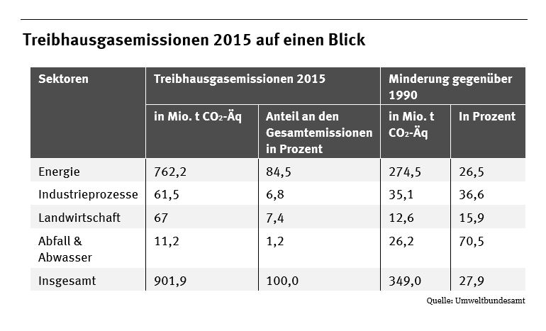 Mit 87,8 Prozent dominierte auch in 2015 Kohlendioxid (CO2) die Treibhausgasemissionen – größtenteils aus der Verbrennung fossiler Energieträger. Es folgen Methan mit 6,2 Prozent sowie Lachgas mit 4,3 Prozent, vor allem aus der Landwirtschaft. Gegenüber 1990 belaufen sich die Emissionsminderungen für Kohlendioxid auf 24,7 Prozent. Methan (CH4) wurde gegenüber 1990 um 53,7 Prozent weniger ausgestoßen, Lachgas (N2O) um 39,8 Prozent.