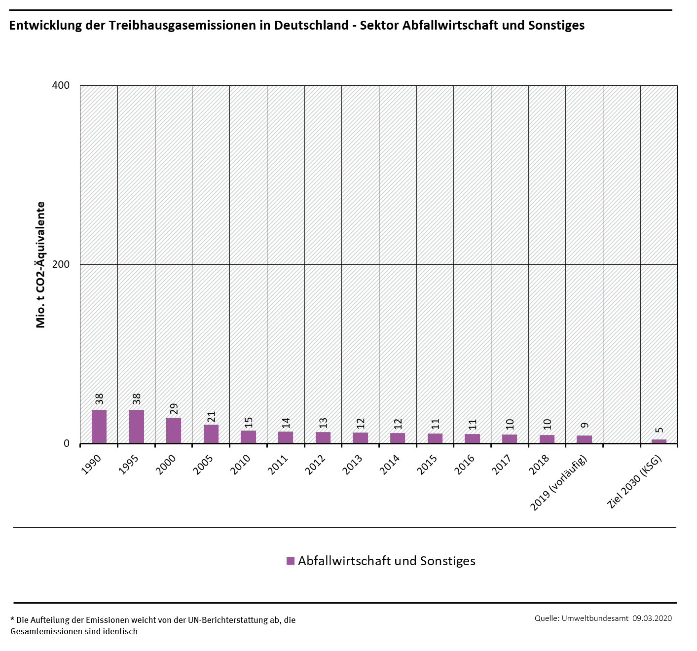 Die Emissionen des Abfallsektors sanken gegenüber dem Vorjahr um 0,5 Mio. Tonnen bzw. um 4,7 %. Der Trend wird bestimmt durch die Emissionen der Abfalldeponierung, die um 5,9 % weiter zurückgingen. Bei den anderen Kategorien gibt es kaum Veränderungen.