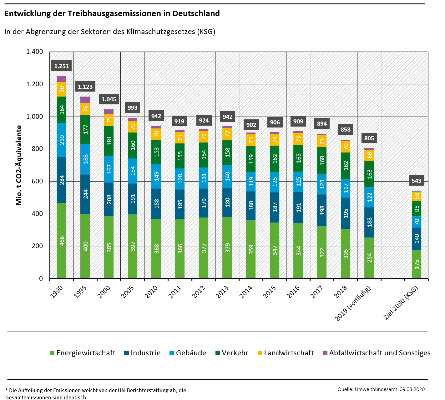 In Deutschland wurden 2019 rund 805 Millionen Tonnen Treibhausgase freigesetzt – rund 54 Millionen Tonnen oder 6,3 Prozent weniger als 2018. Das zeigt die vorläufige Treibhausgas-Bilanz des Umweltbundesamtes (UBA). Damit setzt sich der positive Trend des Vorjahres auch 2019 fort. Mit Ausnahme des globalen Krisenjahres 2009 ist die Minderung im Jahr 2019 der größte jährliche Rückgang seit 1990. Die größten Fortschritte gab es in der Energiewirtschaft. Gründe für diese Entwicklung sind die erfolgreiche Reform des europäischen Emissionshandels, der niedrige Gaspreis, der Ausbau von Wind- und Sonnenenergie sowie die Abschaltung erster Kohlekraftwerksblöcke. Im Vergleich zu 1990 sanken die Emissionen in Deutschland um 35,7 Prozent. Bis 2030 will Deutschland seine Emissionen laut Klimaschutzgesetz um mindestens 55 Prozent mindern.