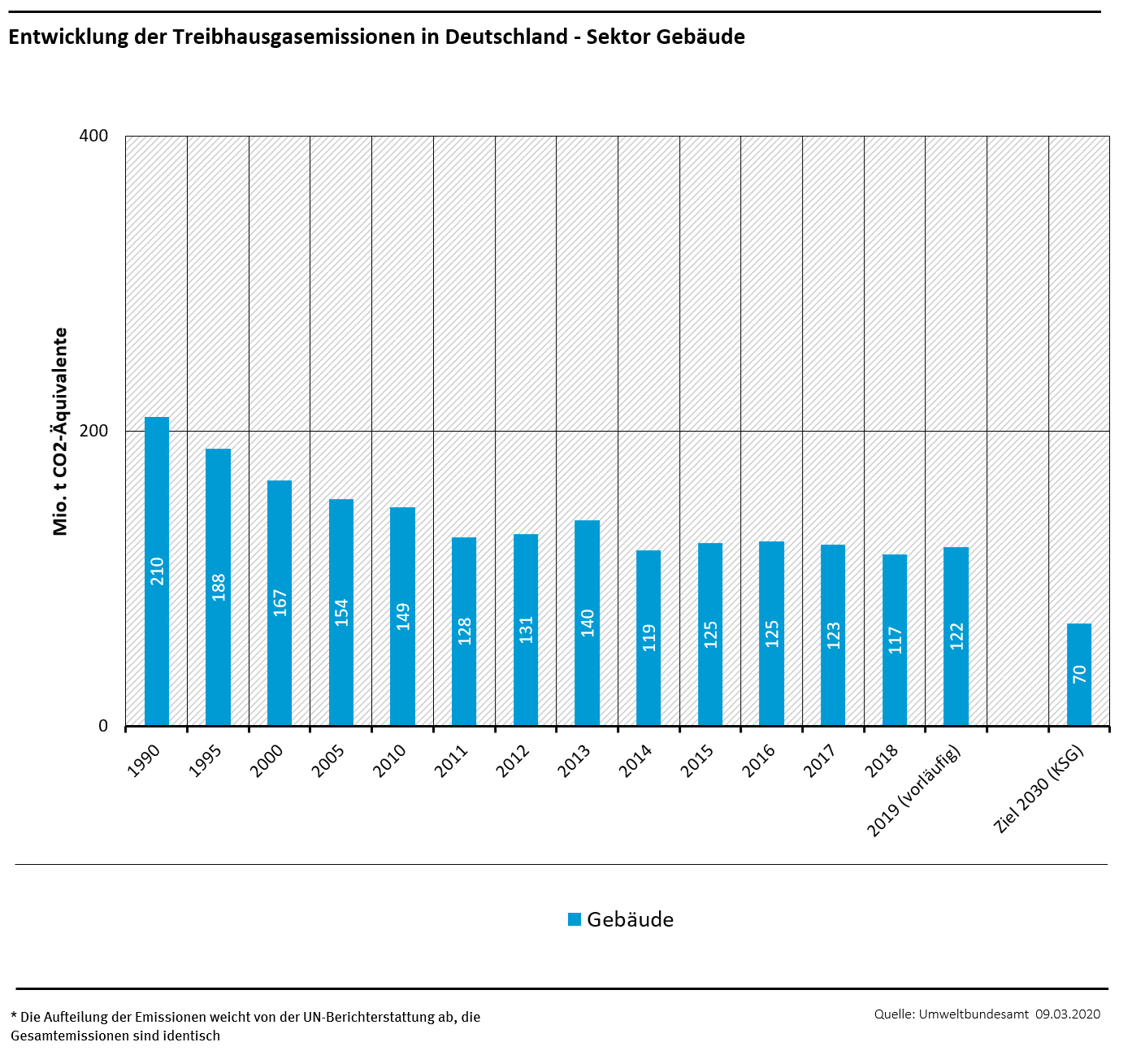Die Emissionen aus dem Gebäudebereich stiegen im Vergleich zum Vorjahr um 5 Mio. Tonnen an (plus 4,4 %). Ein wesentlicher Treiber des Emissionsanstiegs sind die gegenüber dem Vorjahr deutlich gestiegenen Heizölabsätze. Das lag vor allem am Preis: 2019 war der Heizölpreis deutlich niedriger als 2018. Daneben spielte auch die Witterung eine Rolle: Nach dem außergewöhnlich warmen Jahr 2018 war das Jahr 2019 in vielen Teilen Deutschlands wieder etwas kühler.