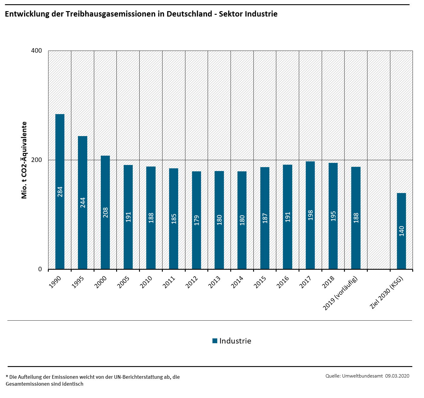 Im Sektor Industrie gehen die Emissionen gegenüber dem Vorjahr um über 7 Mio. Tonnen CO2-Äquivalente zurück (minus 3,7 Prozent). Zum großen Teil ist dieser Rückgang der rückläufigen Brennstoffnutzung in den Industriefeuerungen und der geringeren Stromerzeugung in den Industriekraftwerken zuzuordnen. Im Bereich der Prozessemissionen sanken diese insbesondere in der Stahlindustrie. In der mineralischen Industrie, wie auch in der chemischen Industrie ergeben sich ebenfalls leichte Rückgänge der Treibhausgasemissionen