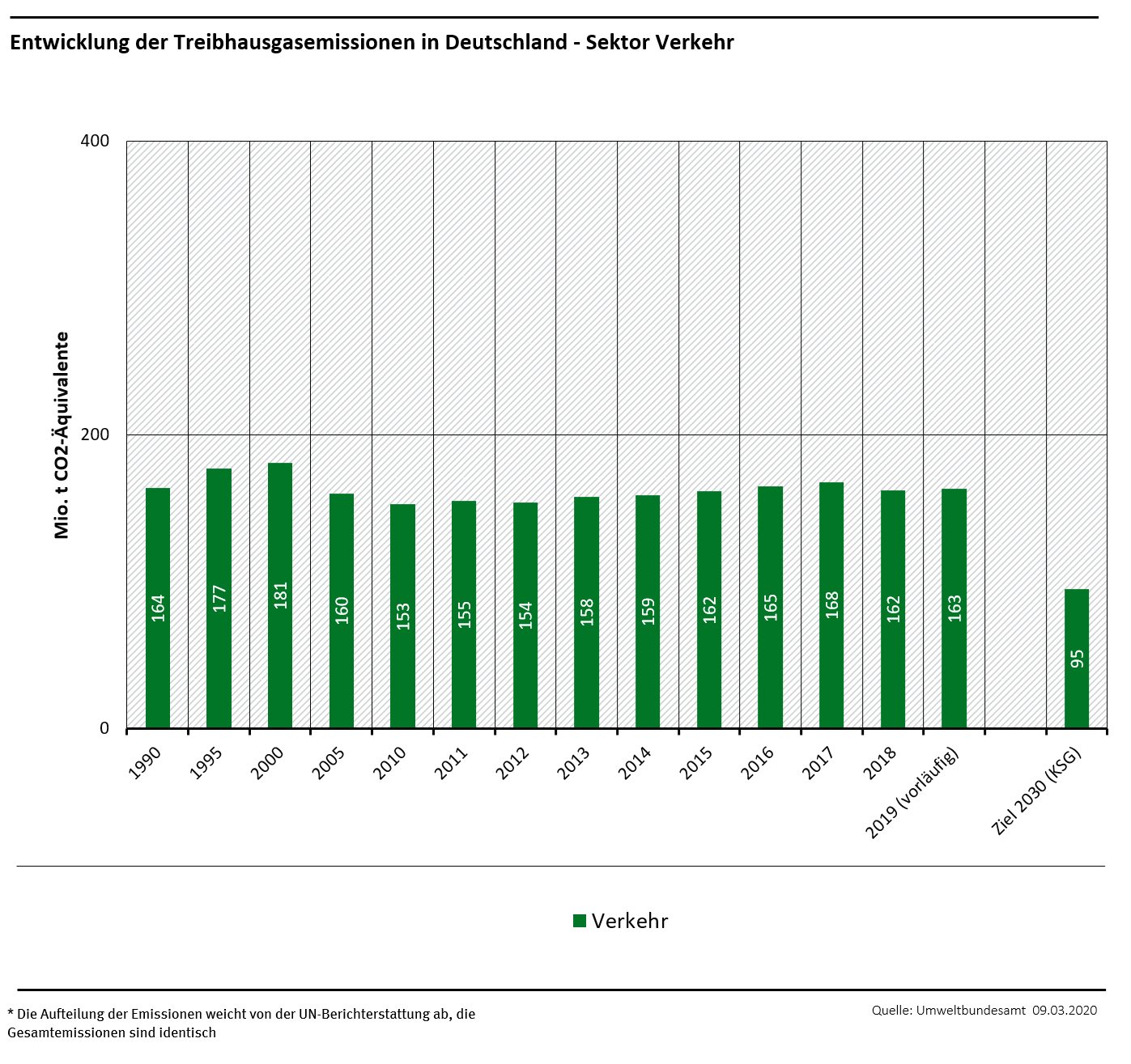 Die Treibhausgasemissionen des Verkehrs liegen mit 163,5 Mio. Tonnen CO2 auf einem leicht höheren Niveau als im Vorjahr (+1,2 Mio. Tonnen bzw. +0,7 %). Zwar kamen sparsamere Fahrzeuge auf den Markt, gleichzeitig nahm aber auch der Kfz-Bestand zu (+1,6%), so dass in Summe mehr Benzin und Diesel verbraucht wurde.