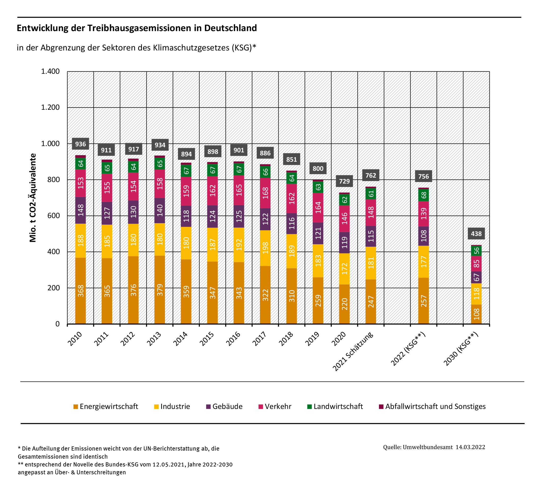 Seit 1990 sanken die Emissionen in Deutschland um 38,7 Prozent. Das Ziel für 2030 ist ein Minus von 65 Prozent. Emissionssteigerungen gegenüber dem Vorjahr gab es 2021 in nahezu allen Bereichen. Die verfügbaren Daten zeigen, dass seit 2010 vor allem die Energiewende zur Reduktion der Emissionen beigetragen hat. Alle anderen bedeutenden Sektoren stagnieren seit 2010 mehr oder weniger.