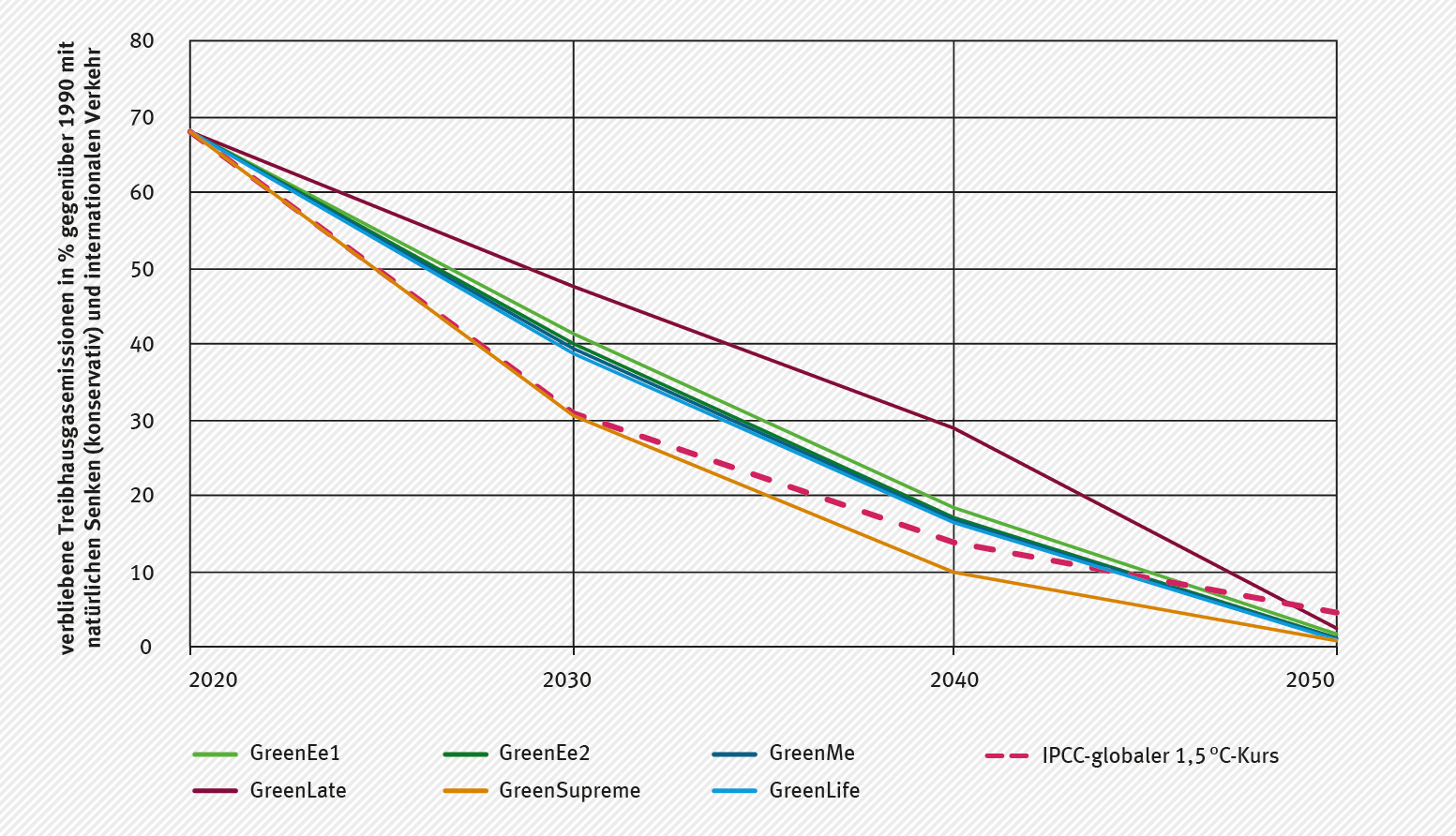 Eines der sechs Szenarien („GreenSupreme“) beschreibt die schnellstmögliche Minderung der Treibhausgasemissionen und des Rohstoffverbrauchs bis 2050. Bis 2040 ist hierfür besonders wichtig der schnelle Ausstieg aus der Kohle. Effiziente und rohstoffarme Techniken, wie Wärmepumpen zur Raumwärmeerzeugung sowie die steigende Nachfrage nach langlebigen, reparierbaren und rohstoffeffizienten Produkten werden präferiert. In diesem Szenario gelingt es, bis zum Jahr 2050 die Treibhausgasemissionen um gut 97 Prozent gegenüber 1990 zu senken. Werden die natürlichen Senken durch nachhaltige land- und forstwirtschaftliche Bewirtschaftung (LULUCF) berücksichtigt, so sind Minderungen um 100 Prozent möglich – es wird der Atmosphäre sogar noch Kohlendioxid (CO2) entzogen. Dies wird auch ohne Atomenergie und technische Senken wie das Abscheiden und Speichern von Treibhausgasen erreicht.