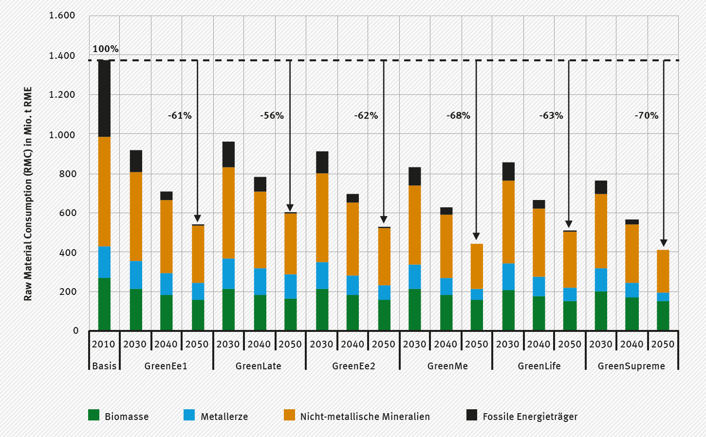 Treibhausgasneutralität führt auch zu einem deutlichen Rückgang des Rohstoffkonsums (Raw Material Consumption – RMC). Im GreenSupreme-Szenario sind es minus 70 Prozent bis 2050 gegenüber 2010. Im Fokus sind vor allem technische Maßnahmen zur Energie- und Materialeffizienz. Darüber hinaus helfen Lebensstiländerungen, wie der Umstieg auf langlebige und reparaturfähiger Produkte, flächensparendes Bauen, die konsequente Ausschöpfung des ökologisch-technischen Recyclingpotenzials, ausgeprägte Materialsubstitution wie der verstärkte Holzbau und der Einsatz innovativer Materialien wie Textilbeton, den Rohstoffbedarf weiter zu senken. Der zeitweise Mehrbedarf an Rohstoffen zur Transformation des Energiesystems, sollte durch einen Technologiemix verringert werden: So können Akkus, die die heute gängigen Lithium-Ionen-Akkus ersetzen, den Bedarf an Lithium und Kobalt für batterieelektrische Fahrzeuge deutlich reduzieren. Andere Generatoren in Windenergieanlagen werden den Bedarf an Kupfer und seltenen Erden für Windenergieanlagen verringern.