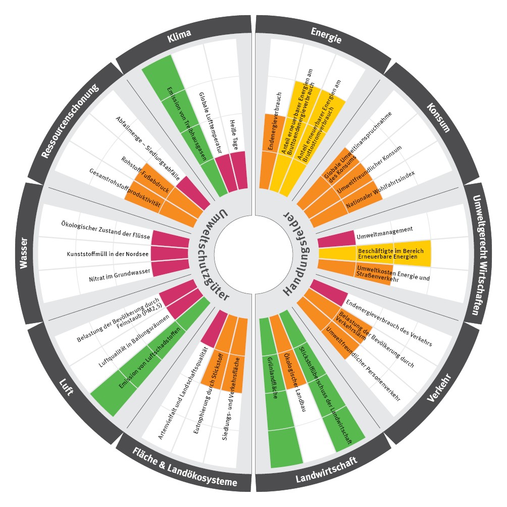 Bei anderen Indikatoren steht wiederum die menschliche Gesundheit im Fokus. So weist der orange bewertete Indikator „Belastung der Bevölkerung durch Verkehrslärm“ darauf hin, dass Straßenverkehrslärm das Leben vieler Menschen in Deutschland beeinträchtigt und weitreichende Auswirkungen auf die Gesundheit haben kann. Hier hat sich die Situation seit 2017 nur wenig verbessert. Obwohl bereits zahlreiche Maßnahmen ergriffen wurden, sind zusätzliche Anstrengungen klar erforderlich.