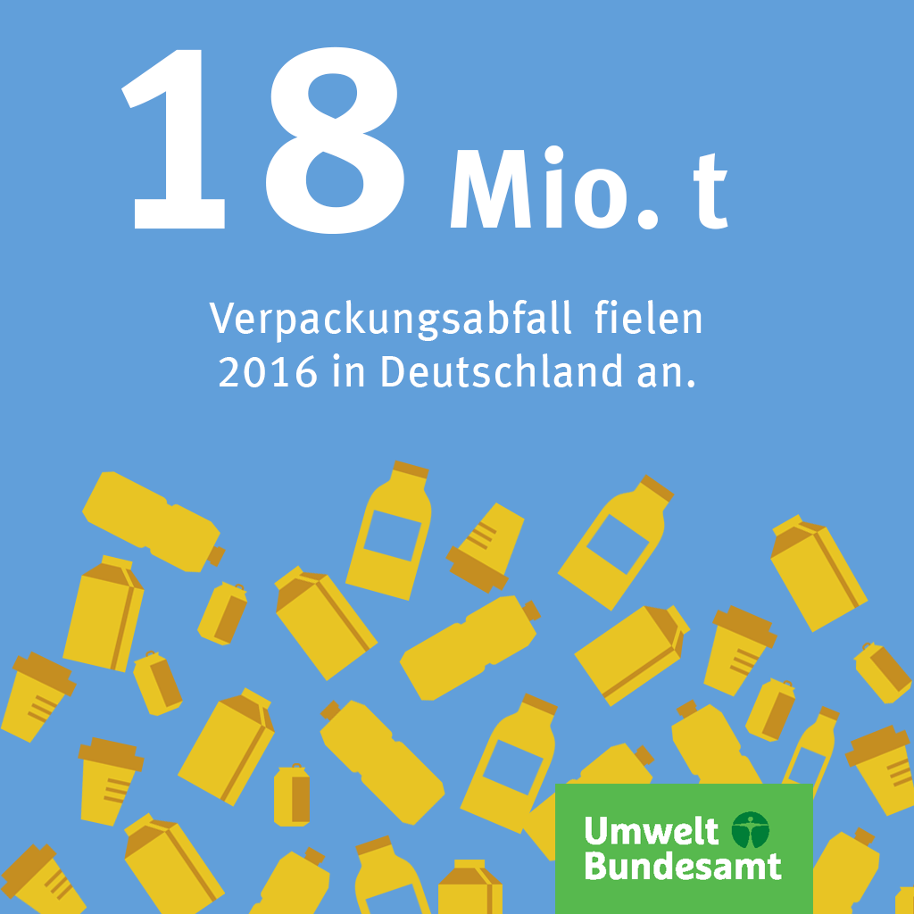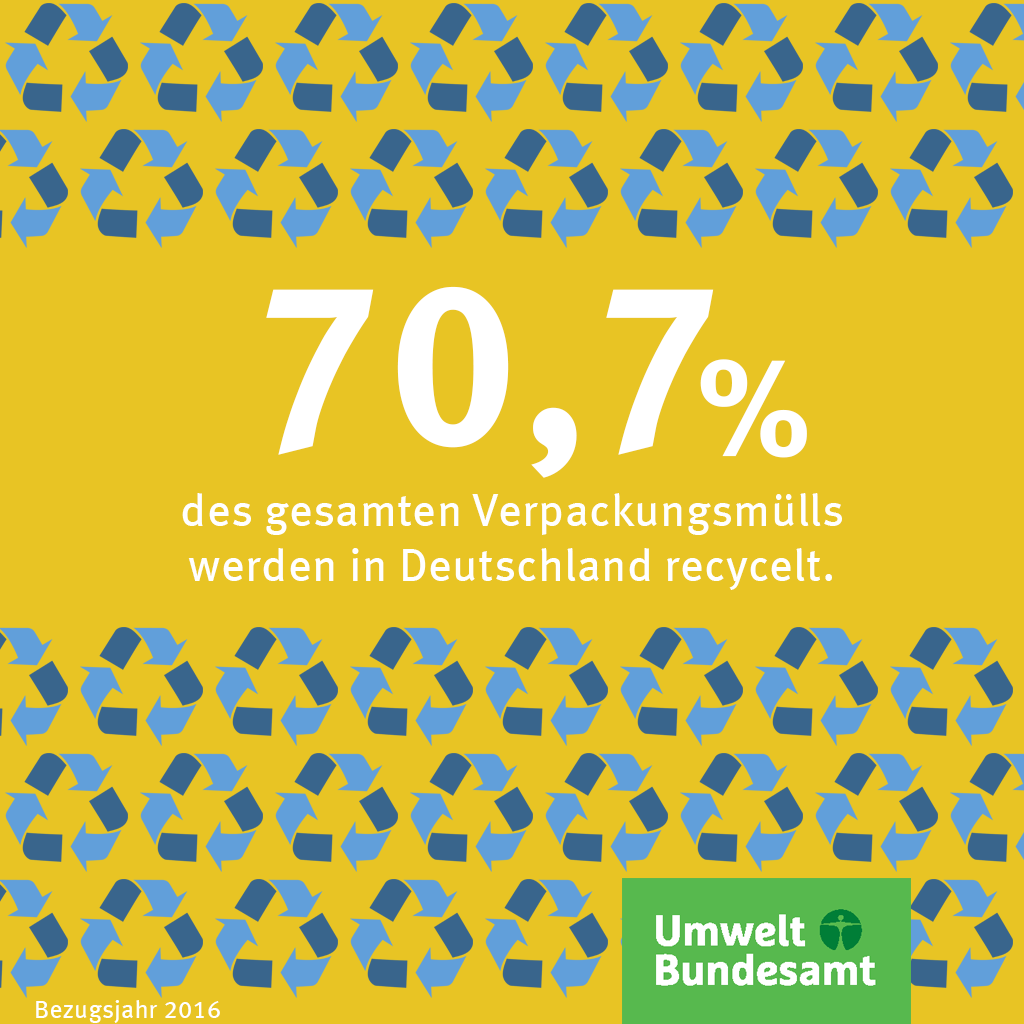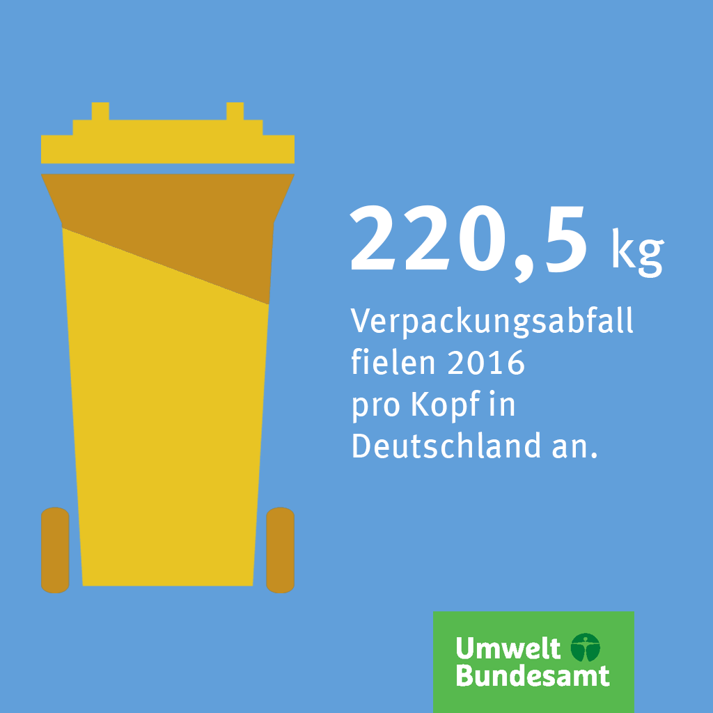 In Deutschland fielen 2016 insgesamt 18,16 Millionen Tonnen Verpackungsabfall an. Das ist ein Anstieg um 0,05 Prozent gegenüber 2015, so der aktuelle Bericht des Umweltbundesamtes (UBA) zu Aufkommen und Verwertung von Verpackungen in Deutschland. Dies entspricht 220,5 kg Verpackungsabfall pro Kopf. Im Vergleich dazu lag der pro-Kopf-Verbrauch in der EU 2015 bei 167,3 kg pro Kopf. 70 Prozent des Verpackungsabfalls wurden dem Recycling zugeführt, der Rest wurde großteils energetisch verwertet. Maria Krautzberger, Präsidentin des UBA: „Wir produzieren viel zu viel Verpackungsmüll – ein trauriger Spitzenplatz in Europa. Das ist schlecht für die Umwelt und für den Rohstoffverbrauch. Zunächst müssen wir das Recycling und den Rezyklateinsatz weiter stärken, um Ressourcen zu schonen. Und vor allem müssen wir Müll vermeiden, auch schon in der Produktionsphase durch den Verzicht auf unnötige und unnötig materialintensive Verpackungen. Außerdem sollten Mehrwegsysteme gestärkt werden, die klare ökologische Vorteile gegenüber Einwegverpackungen haben.“