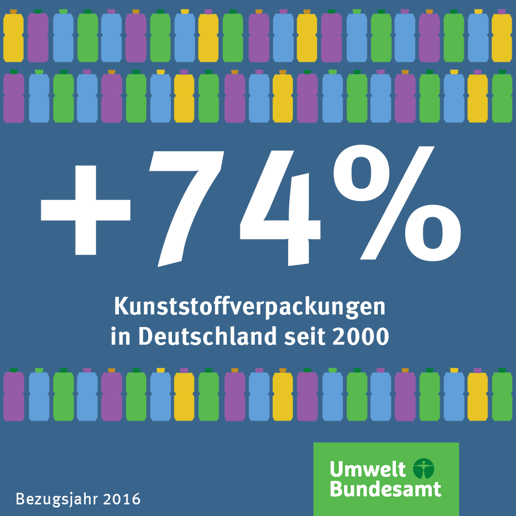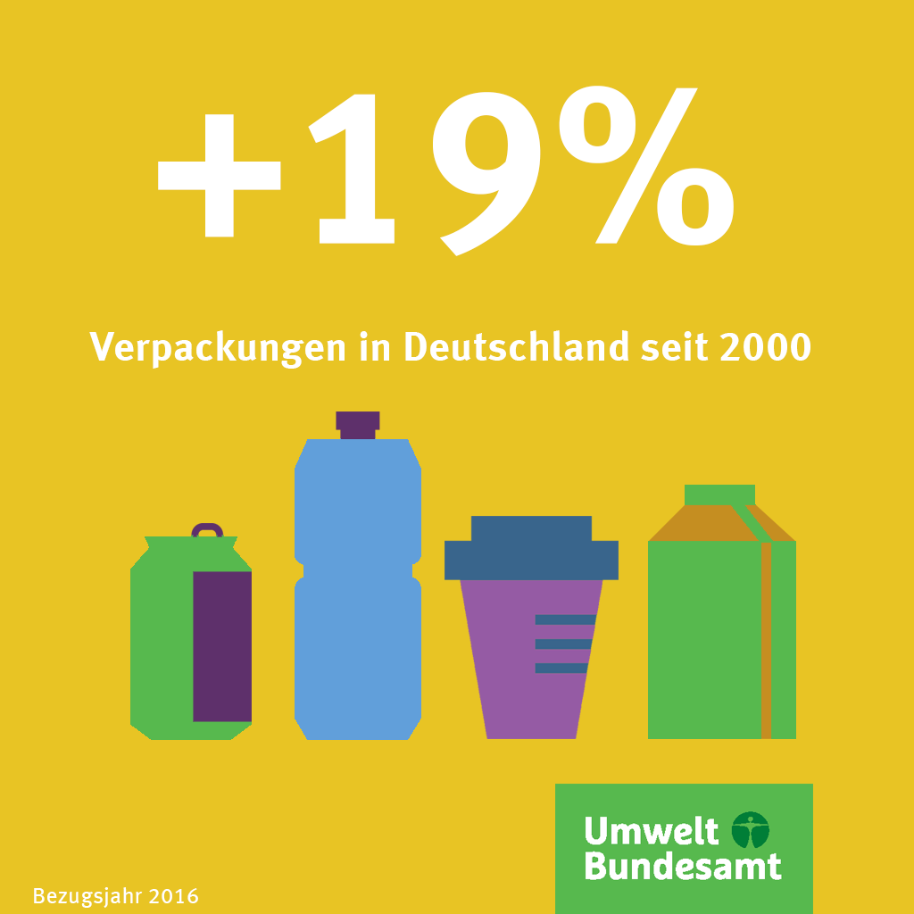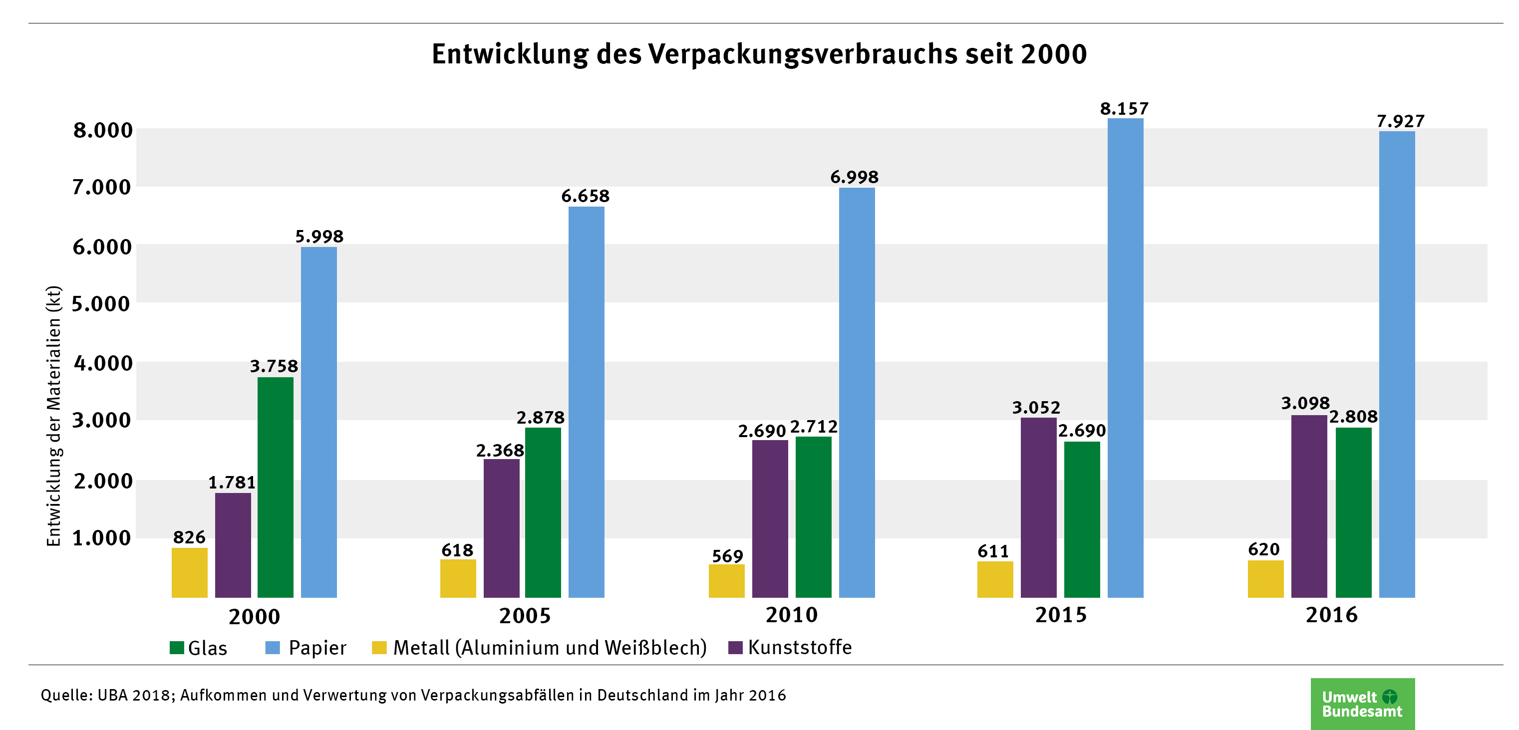 In Deutschland fielen 2016 insgesamt 18,16 Millionen Tonnen Verpackungsabfall an. Das ist ein Anstieg um 0,05 Prozent gegenüber 2015, so der aktuelle Bericht des Umweltbundesamtes (UBA) zu Aufkommen und Verwertung von Verpackungen in Deutschland. Dies entspricht 220,5 kg Verpackungsabfall pro Kopf. Im Vergleich dazu lag der pro-Kopf-Verbrauch in der EU 2015 bei 167,3 kg pro Kopf. 70 Prozent des Verpackungsabfalls wurden dem Recycling zugeführt, der Rest wurde großteils energetisch verwertet. Maria Krautzberger, Präsidentin des UBA: „Wir produzieren viel zu viel Verpackungsmüll – ein trauriger Spitzenplatz in Europa. Das ist schlecht für die Umwelt und für den Rohstoffverbrauch. Zunächst müssen wir das Recycling und den Rezyklateinsatz weiter stärken, um Ressourcen zu schonen. Und vor allem müssen wir Müll vermeiden, auch schon in der Produktionsphase durch den Verzicht auf unnötige und unnötig materialintensive Verpackungen. Außerdem sollten Mehrwegsysteme gestärkt werden, die klare ökologische Vorteile gegenüber Einwegverpackungen haben.“