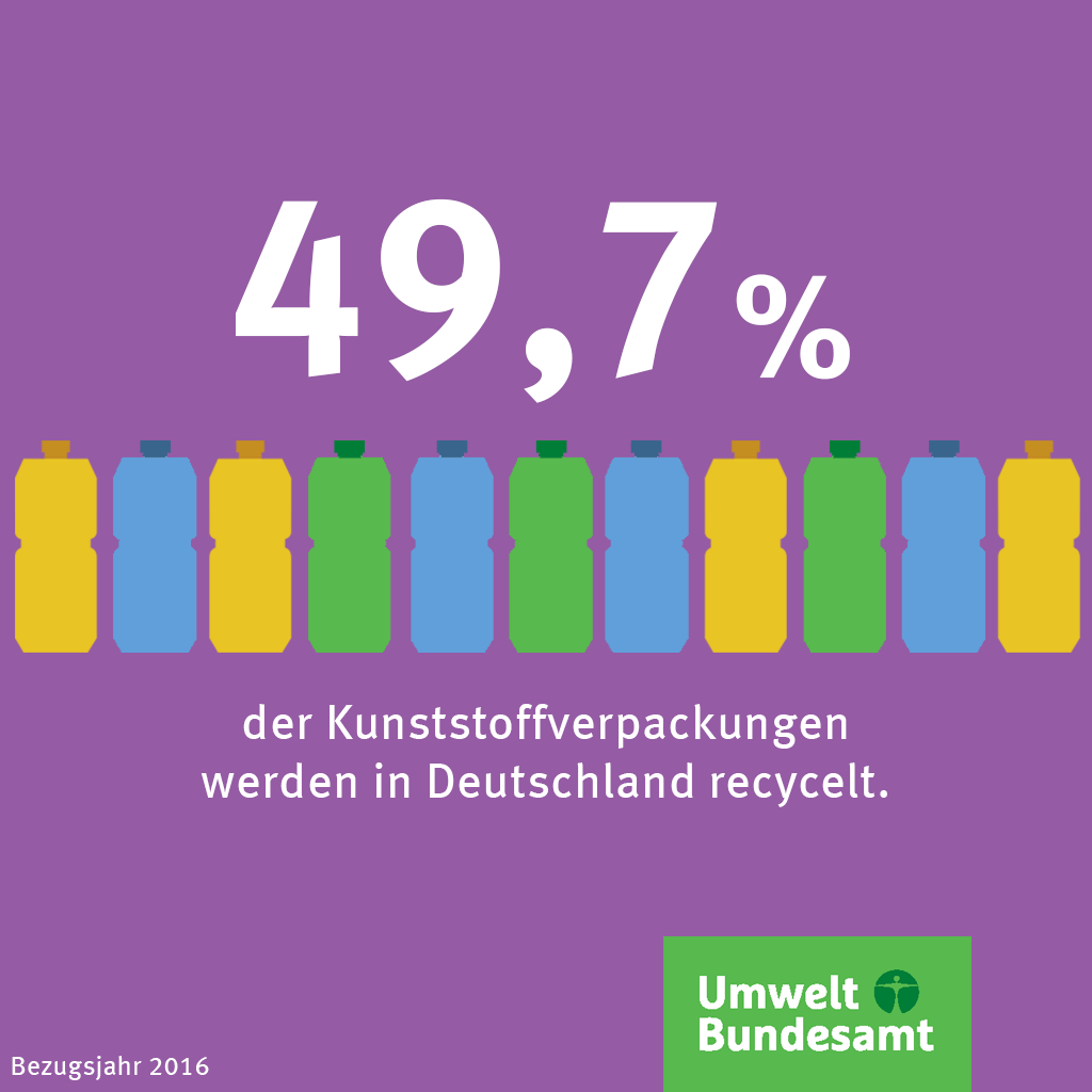 Ab 1.1.2019 tritt das neue Verpackungsgesetz in Kraft. Dann muss zumindest das Kunststoffrecycling der Verpackungen weiter gesteigert werden, die im dualen System anfallen. Zunächst liegt die Quote bei 58,5 Prozent, ab 2022 bei 63 Prozent. Dies betrifft alle Verpackungen, mit denen sich Hersteller bei dualen Systemen beteiligen müssen und die über die Wertstoffsammlungen (Glas-, Papiersammlung, Gelber Sack, Gelbe Tonne, Wertstofftonne und Wertstoffhöfe) entsorgt werden.