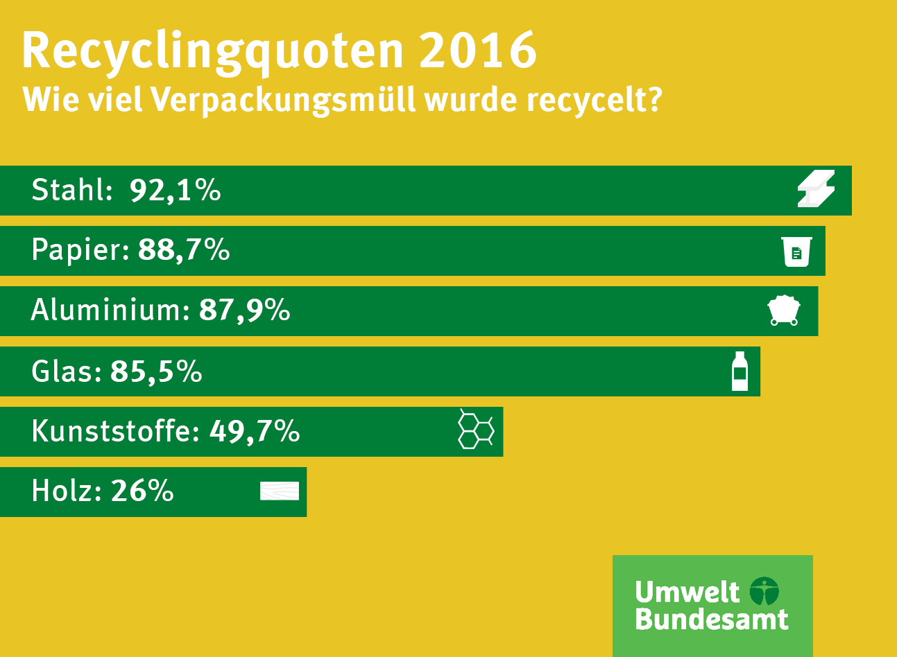 Die Recyclingquote variiert bei den unterschiedlichen Verpackungen. Vergleichsweise hoch ist sie bei Glas (85,5 %), Papier/Karton (88,7 %), Aluminium (87,9 %) und Stahl (92,1 %). Bei Kunststoffen (49,7 %) und Holz (26 %) gibt es jedoch noch viel Potential. Gerade Kunststoffverpackungen sind aufgrund der Materialvielfalt schwierig zu sortieren und recyceln. 2016 konnten immerhin 0,9 Prozent mehr Kunststoffverpackungen recycelt werden als im Vorjahr; erstmals mehr als der energetischen Verwertung zugeführt wurde. Maria Krautzberger: „Insbesondere bei Kunststoffen müssen wir das wertvolle Material stärker dem Recycling zuführen und weiter nutzen.“