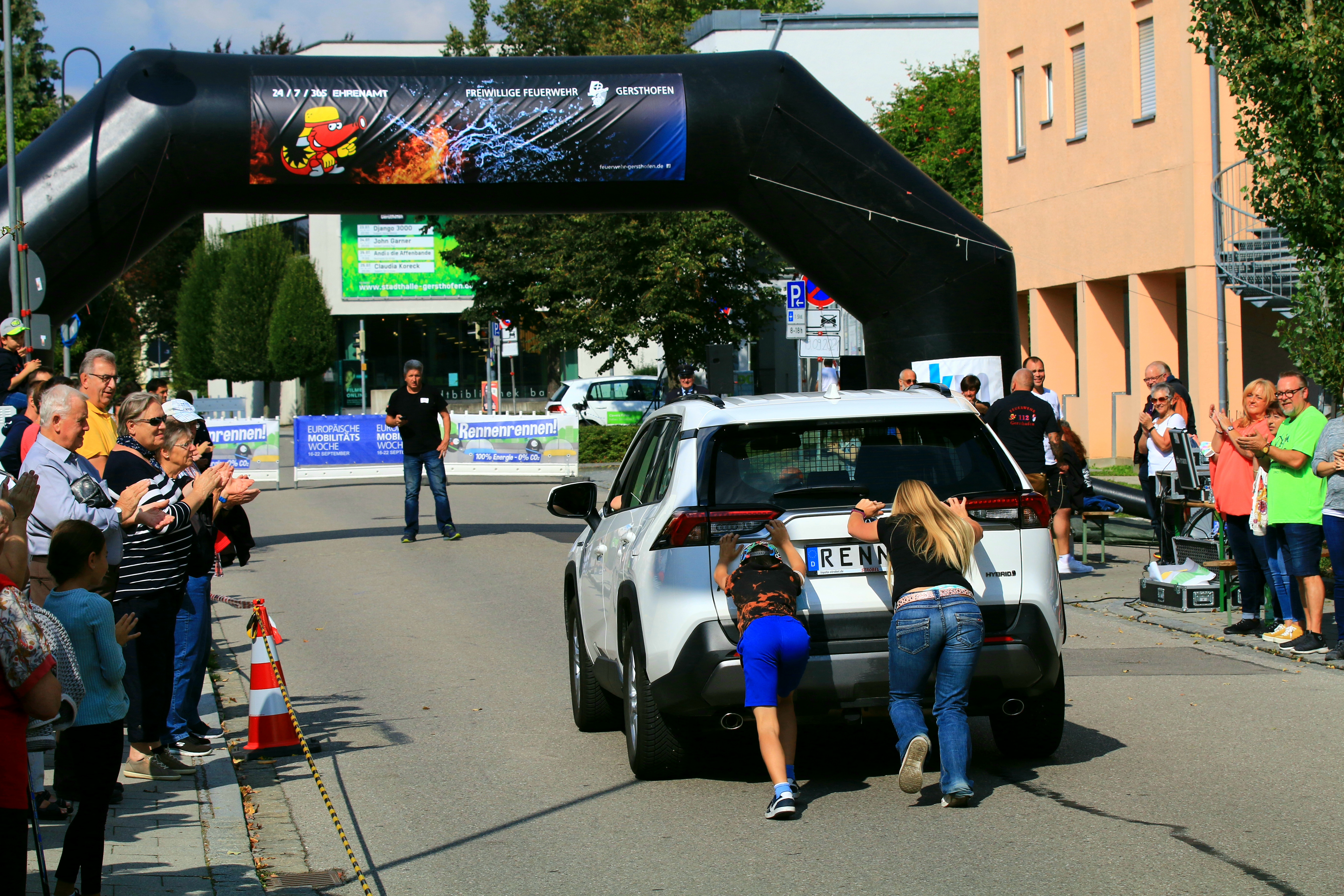 Jeweils zwei SUV treten gegeneinander an. Spätestens an der Startposition werden die Motoren ausgeschaltet. Die Fahrzeuge werden von je einem Zweierteam die 100 Meter lange Rennstrecke entlang geschoben. Alles andere bleibt gleich: Ein Startsignal eröffnet das Rennen, die Zielfahne beendet es. Es gewinnt das Team, das zuerst die Ziellinie überquert. Um die Umsetzung zu vereinfachen, sollten die Autos und die Personen hinterm Steuer in jedem Durchgang des Rennens beibehalten werden. Die eigentlichen Akteure sind die Schieber*innen. Sie treten in einer oder mehreren K-O-Runden gegeneinander an.