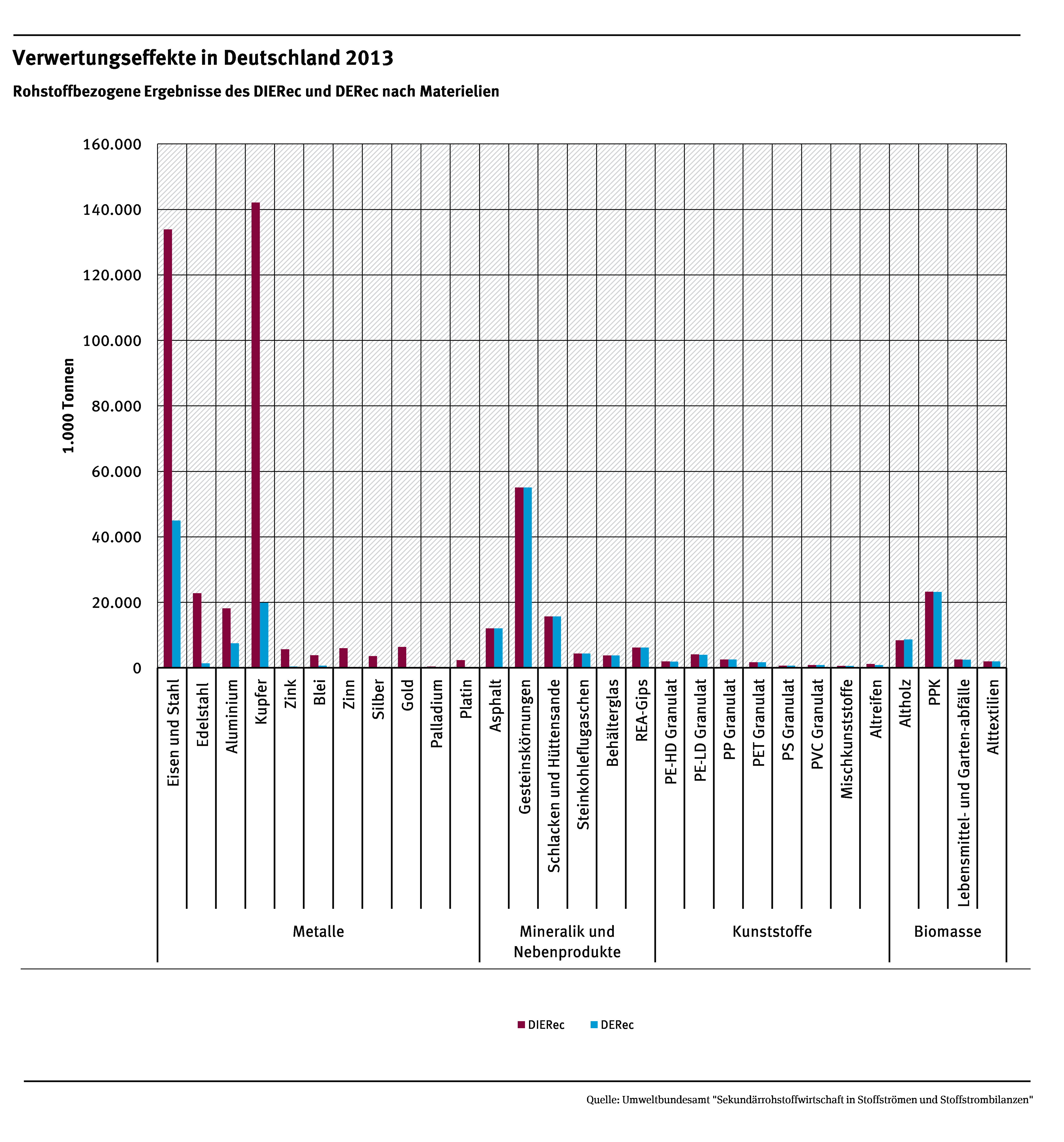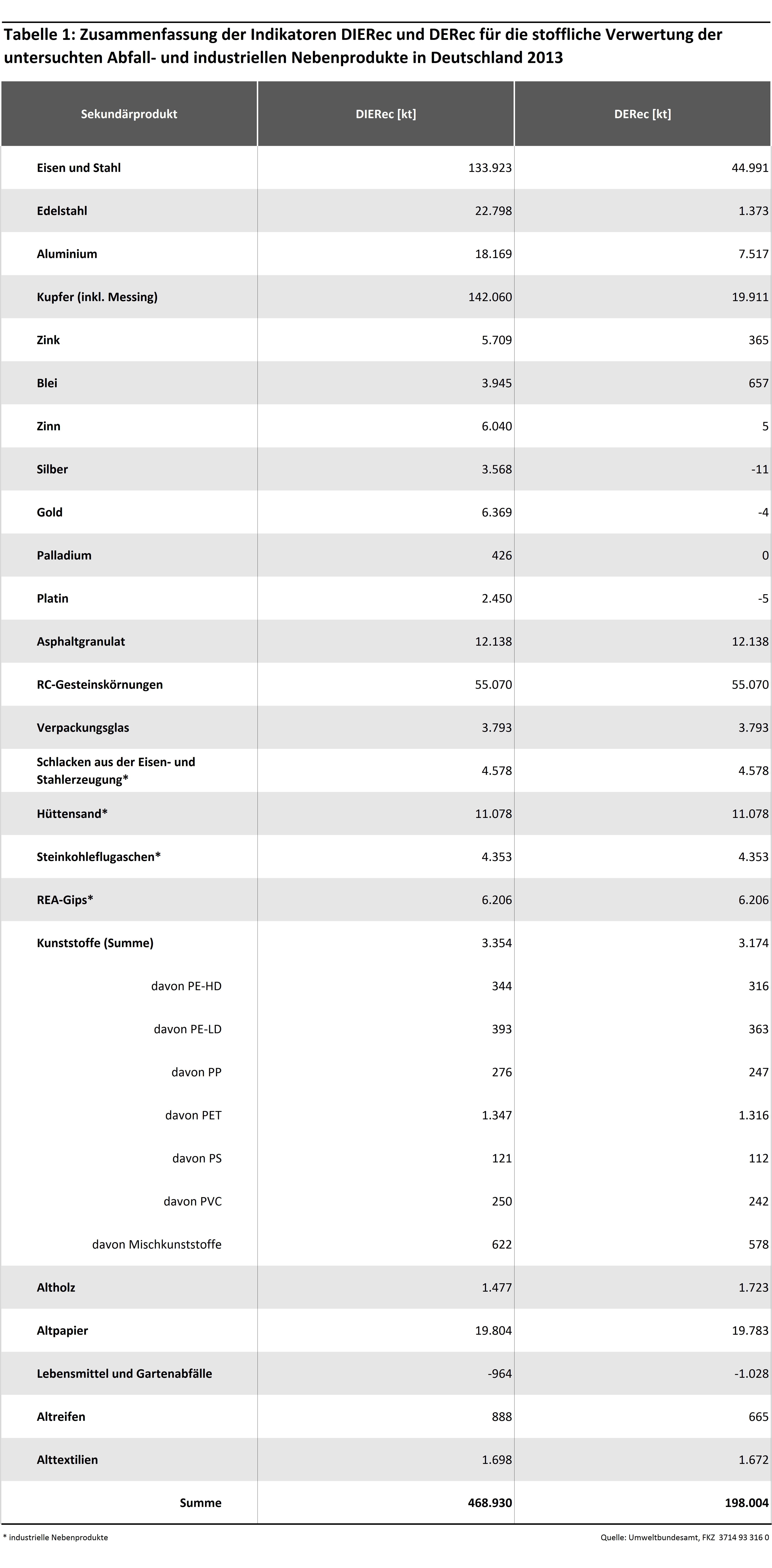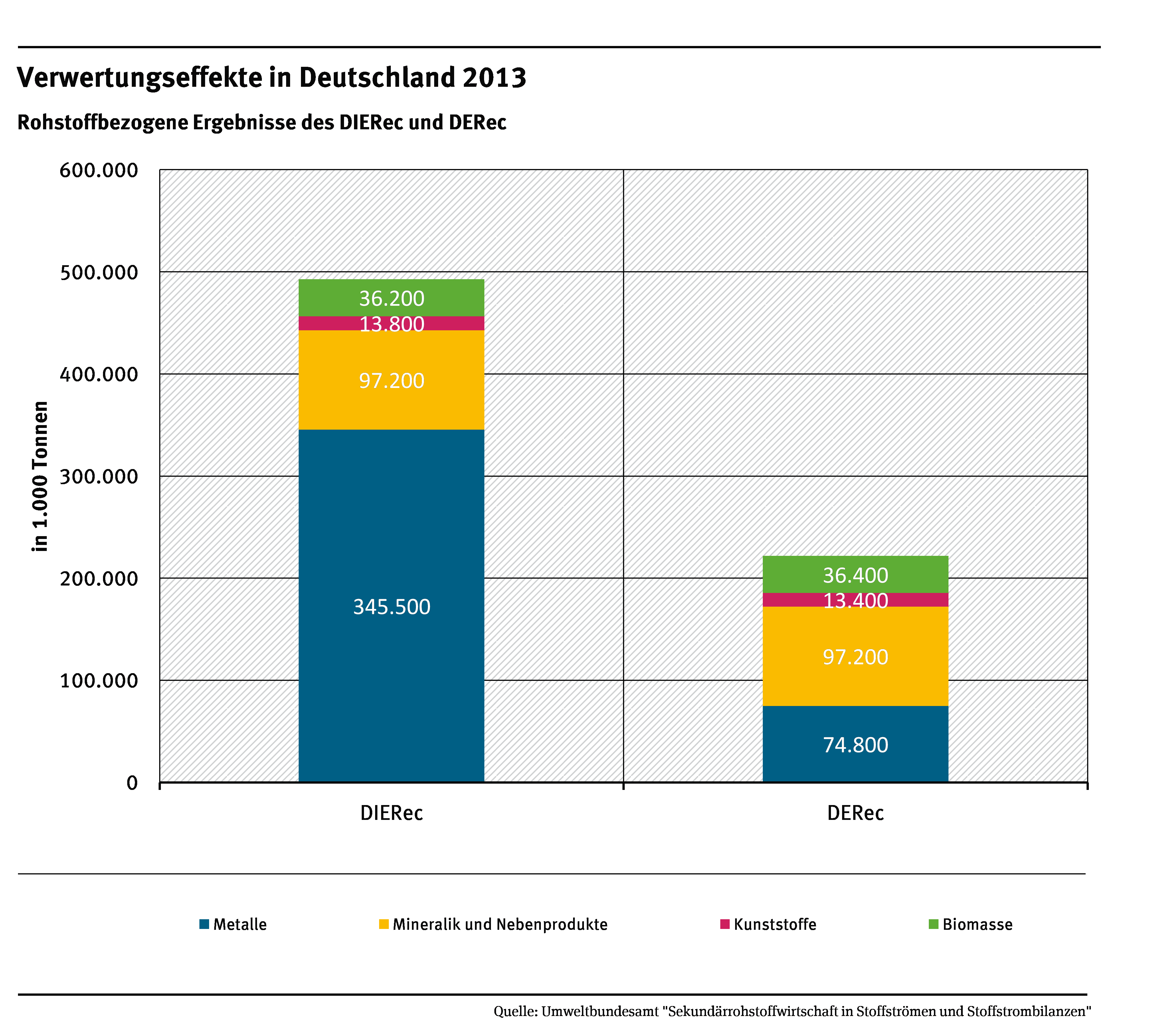 Der Primärmaterialeinsatz in Deutschland betrug im Jahr 2013 1.683 Mio. Tonnen – gemessen als direkter Materialeinsatz DMI. Darin enthalten sind auch Aufwendungen zur Sammlung und Aufbereitung von Sekundärrohstoffen. Jedoch werden dadurch deutlich mehr Primärmaterialien eingespart. Ohne die Bewirtschaftung der untersuchten 30 Materialien in Deutschland wäre der DMI rechnerisch um den DERec im Umfang von 222 Mio. t auf 1.904 Mio. t erhöht. Dies entspricht einem theoretischen Anstieg des DMI um 13 %.