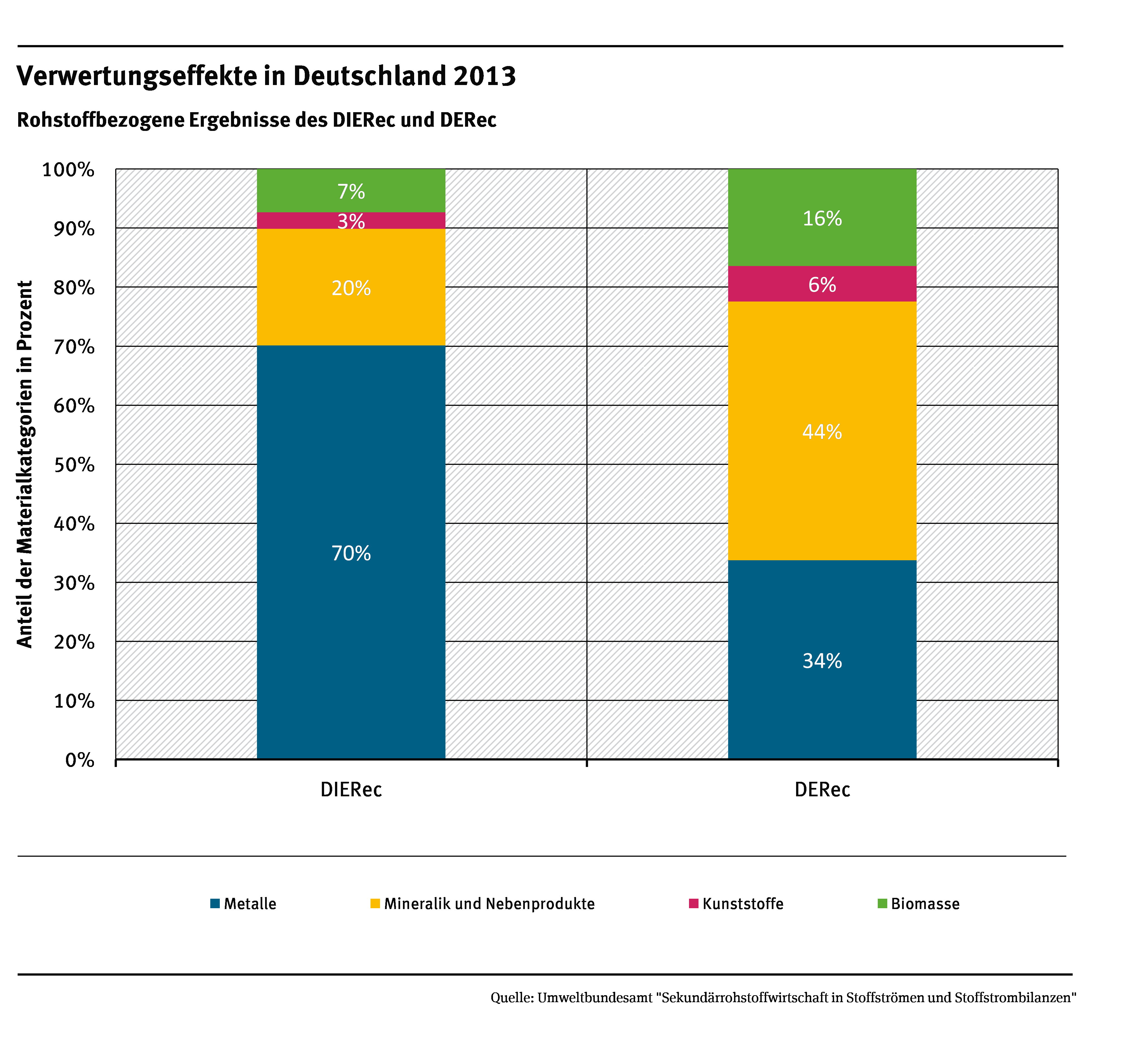 Aufgrund der hohen Rohstoffaufwendungen zur Gewinnung und Aufbereitung von Erzen wird der DIERec vor allem durch die Verwertung der Metalle, dabei insbesondere die Materialien Eisen und Stahl (29 %) sowie Kupfer (27 %) geprägt. Im DERec kommt hingegen die Bedeutung der inländischen nichtmetallischen Materialwirtschaft deutlicher zum Tragen, insbesondere durch Recyclinggesteinskörnungen (25 %), industrielle Nebenprodukte (12 %) und PPK (10 %).