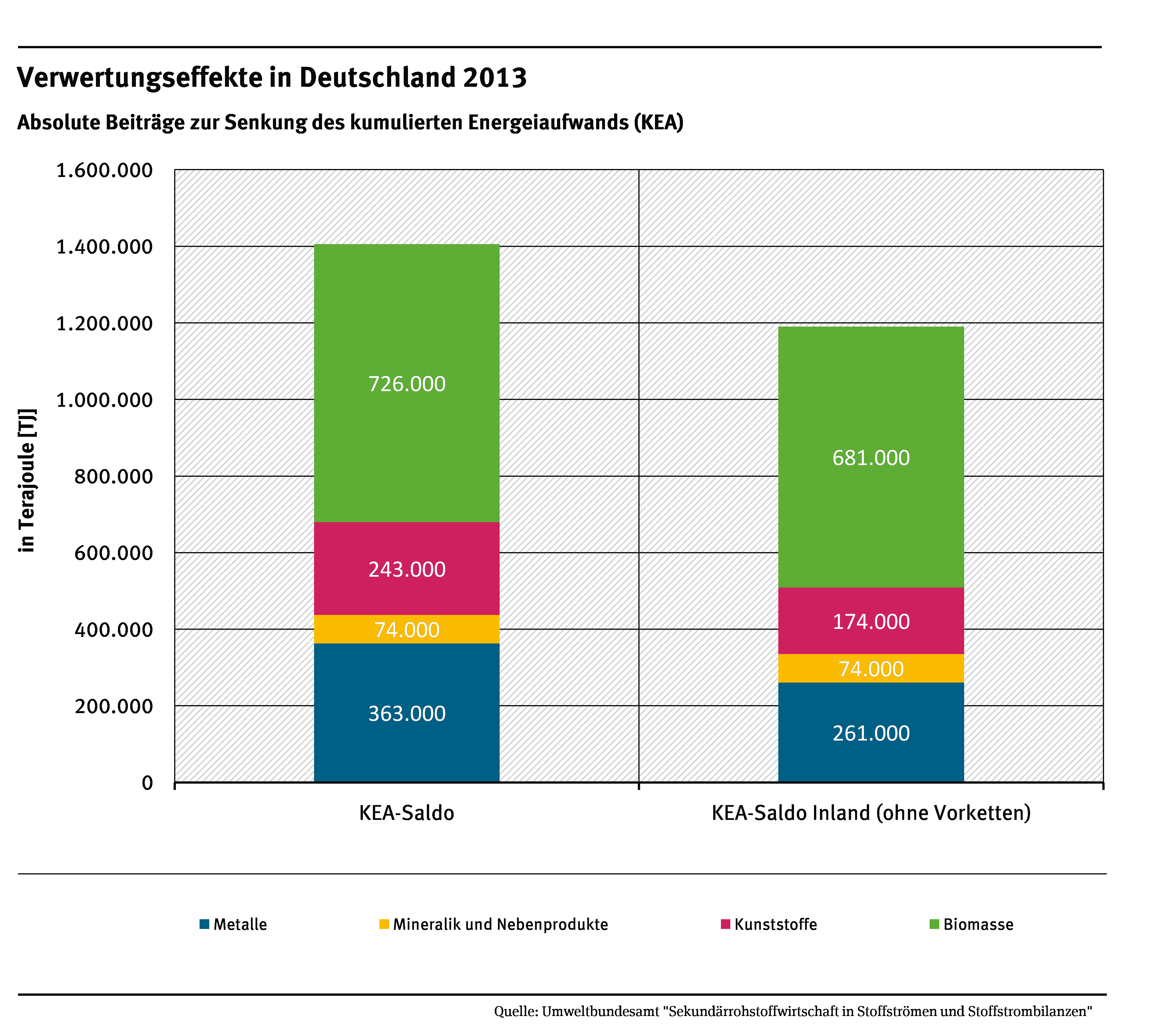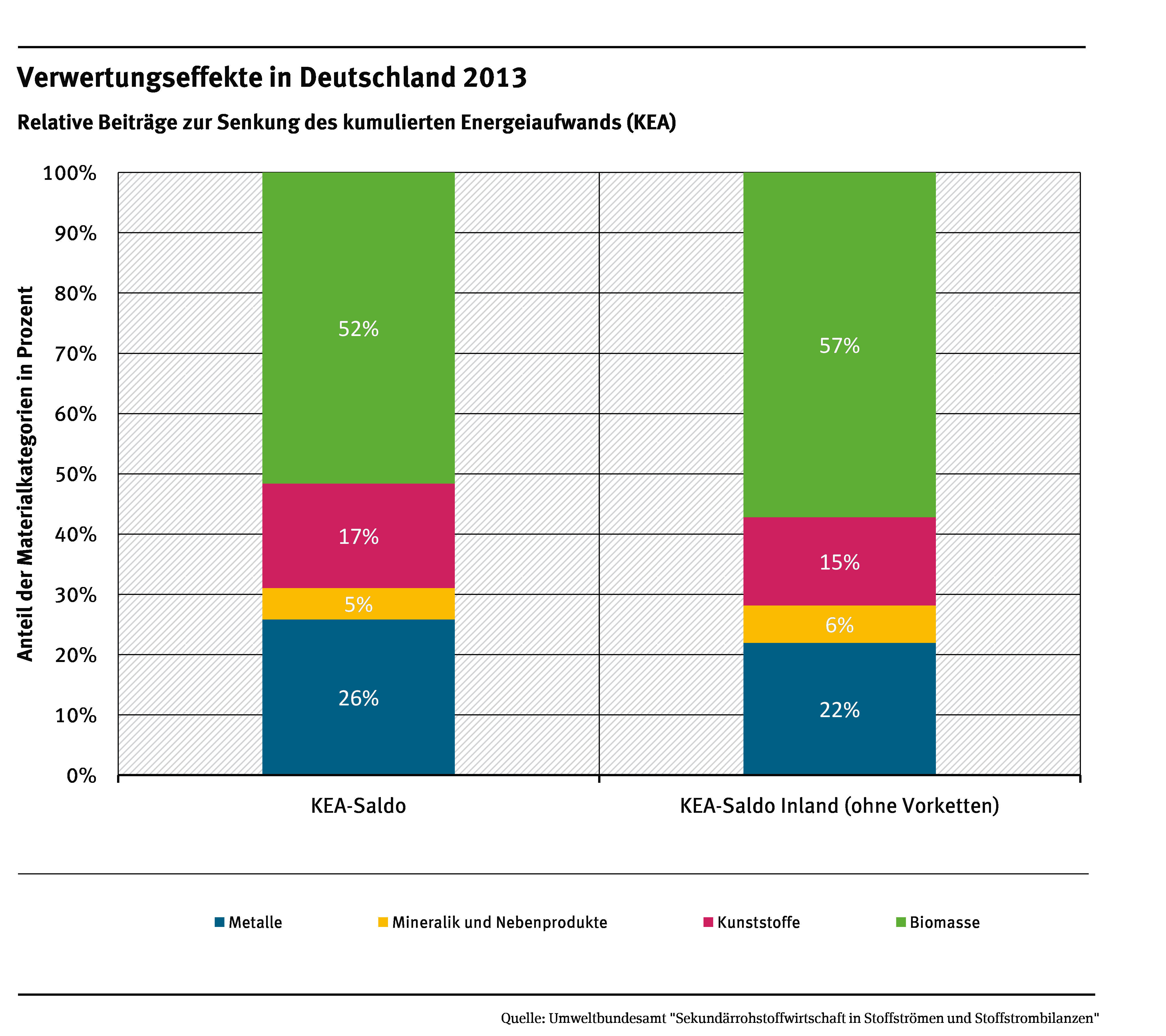 Die direkten Effekte auf den Energieverbrauch innerhalb der Bundesrepublik werden anhand des KEA-Saldos ohne Vorketten bemessen. Dieser berücksichtigt nur die Energieeinsätze zur Sekundärrohstoffgewinnung sowie den Teil der im Inland stattfindenden Primärprozessrouten. Durch die Substitution von Primärrohstoffen durch die verwerteten Abfälle und Nebenprodukte der 30 untersuchten Materialien wurde im Inland ein Energieverbrauch von 1.194 PJ vermieden. Wenn keine Verwertung von Sekundärrohstoffen in Deutschland existieren würde, so hätte unter Annahme gleicher Produktionsmuster und Technologien in jenem Umfang zusätzlich Energie eingesetzt werden müssen. Im Verhältnis zur Energiegewinnung im Inland im Jahr 2013, welche sich auf 4.109 PJ belief, entspricht dies einem Anteil  von 29 %.  Dies zeigt, dass die Sekundärrohstoffwirtschaft im Verhältnis zur inländischen Energiegewinnung ein sehr bedeutender Sektor zur Energiebereitstellung ist, was zum einen auf der energetischen Verwertung von heizwertreichen Abfällen und zum anderen auf der Vermeidung von energieintensiven metallurgischen Prozessen beruht.