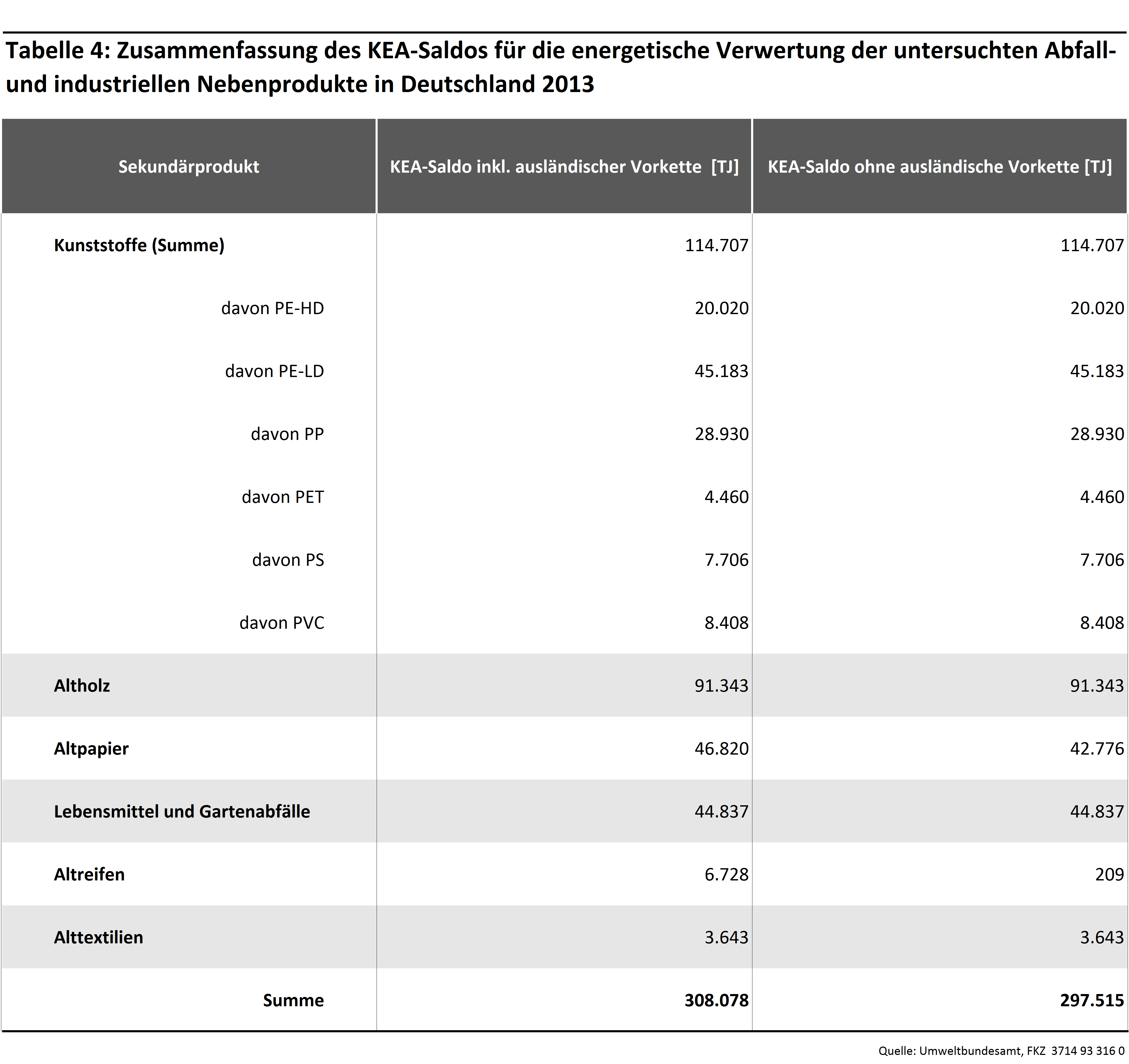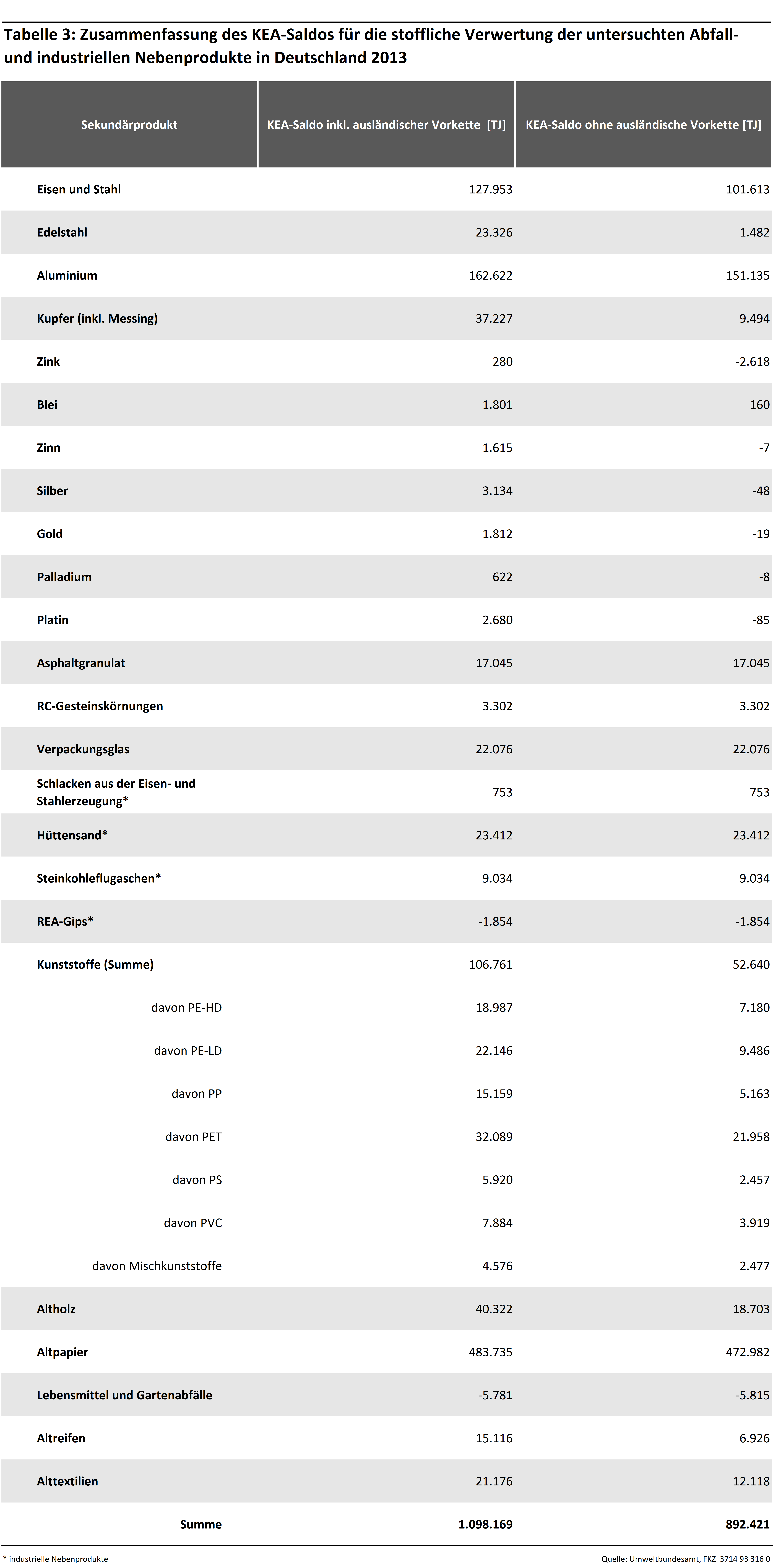 Die direkten und indirekten Effekte auf den Energieverbrauch einschließlich der globalen Auswirkungen werden anhand des KEA-Saldos bemessen. Durch die Substitution von Primärrohstoffen durch die verwerteten Abfälle und Nebenprodukte der 30 untersuchten Materialien wurde ein Energieverbrauch von 1.406 PJ vermieden. Wenn keine Verwertung von Sekundärrohstoffen in Deutschland existieren würde, so hätte unter Annahme gleicher Produktionsmuster und Technologien in jenem Umfang global zusätzlich Energie eingesetzt werden müssen. Dies entspricht rund 6 % des Primärenergieaufkommens der Bundesrepublik, das 2013 bei 24.512 PJ lag.