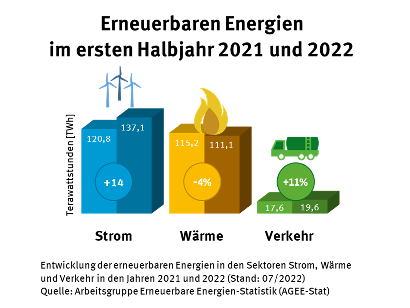 vor Kurzem wurde der Monatsbericht Plus zur Entwicklung der Erneuerbaren Energien in Deutschland im ersten Halbjahr 2022 veröffentlicht. Damit präsentiert die Arbeitsgruppe Erneuerbare Energien-Statistik (AGEE-Stat) erste Daten zur Entwicklung der erneuerbaren Energien in den Bereichen Strom, Wärme und Verkehr für das erste Halbjahr 2022. In der Broschüre finden Sie aktuelle Daten und Grafiken zu den wichtigsten Indikatoren für die erneuerbaren Energien. Dieser Newsletter gibt Ihnen eine Kurzzusammenfassung der Ergebnisse und alle wichtigen Links zu den neuen Daten.