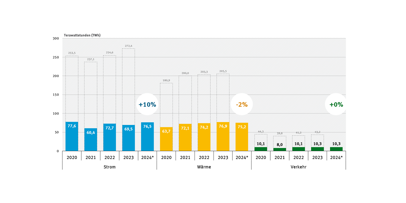Weil der Anteil an „grünem Strom“ im Strommix bei gleichzeitig wachsendem Bestand an E-Autos anstieg, wurde rechnerisch aber deutlich mehr erneuerbarer Strom im Verkehrssektor genutzt (+14 Prozent). Insgesamt wurden etwa 2,3 Terawattstunden (TWh) Strom aus erneuerbaren Quellen im Verkehrssektor verbraucht und damit das Minus bei den Biokraftstoffen ausgeglichen.