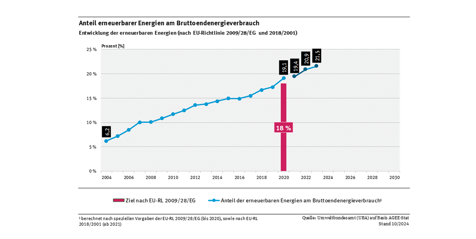 Der Anteil erneuerbarer Energien am Bruttoendenergieverbrauch steigt von 20,9 % im Jahr 2022 auf 21,5 % im Jahr 2023 an. Die sektoralen Anteile stiegen ebenfalls: Im Stromsektor stieg der Anteil erneuerbarer Energien von 47,9 % (2022) auf 52,2 % (2023), im Sektor Wärme und Kälte von 17,6 % (2022) auf 17,1 % (2023) und im Verkehrssektor von 10,1 % (2022) auf 11,9 % (2023).