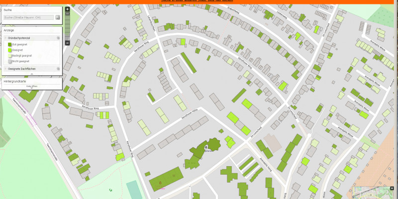 Die Emschergenossenschaft (EG) und der Regionalverband Ruhr (RVR) haben daher gemeinsam ein Gründachkataster für das Ruhrgebiet erstellen lassen. Hier können die Bürgerinnen und Bürger der Region die Gründach-Eignung ihres Gebäudes prüfen. Das Kataster zeigt durch Einfärbung der Dachflächen nicht nur an, wie gut sich das Gebäude für ein Gründach eigne. Über eine Detailanalyse können auch die eingesparte Abwassermenge, die CO2-Absorption und der gehaltene Feinstaub pro Jahr geschätzt werden.