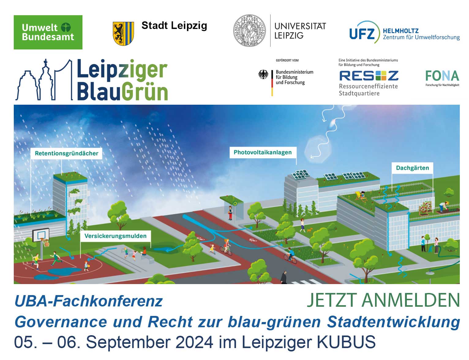 Im Rahmen des BMBF-Projektes Leipziger BlauGrün organisiert das Umweltbundesamt zusammen mit dem Leipziger UFZ die Fachkonferenz „Goverance und Recht der blaugrünen Stadtentwicklung“ am 5./6. September 2024 in Leipzig. Sie zielt darauf ab, den bundesweiten fachlichen Austausch über politische, steuerungsrelevante und rechtliche Fragen blaugrüner Stadtentwicklung zu befördern.