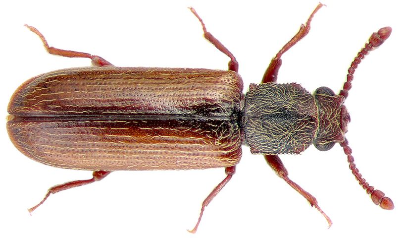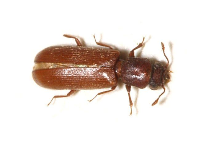 zum Vergrößern anklickenSplintholzkäfer gehören zur Familie der Bohrkäfer. In Deutschland gibt es zwei heimische und einige durch Warentransporte eingeschleppte Arten. Zu den heimischen Arten gehört der Parkettkäfer (Lyctus linearis) und der Behaarte Splintholzkäfer (Lyctus pubescens). Beide Arten sind mittlerweile in der Natur sehr selten geworden und leben synanthrop (also in Gemeinschaft mit Menschen), spielen neben den eingeschleppten Arten aber nur noch eine untergeordnete Rolle. Eingeschleppt und in Deutschland etabliert sind der Braune Splintholzkäfer (Lyctus brunneus), der Grubenhalsige Splintholzkäfer (Lyctus cavicollis) und der Amerikanische Splintholzkäfer (Lyctus planicollis).