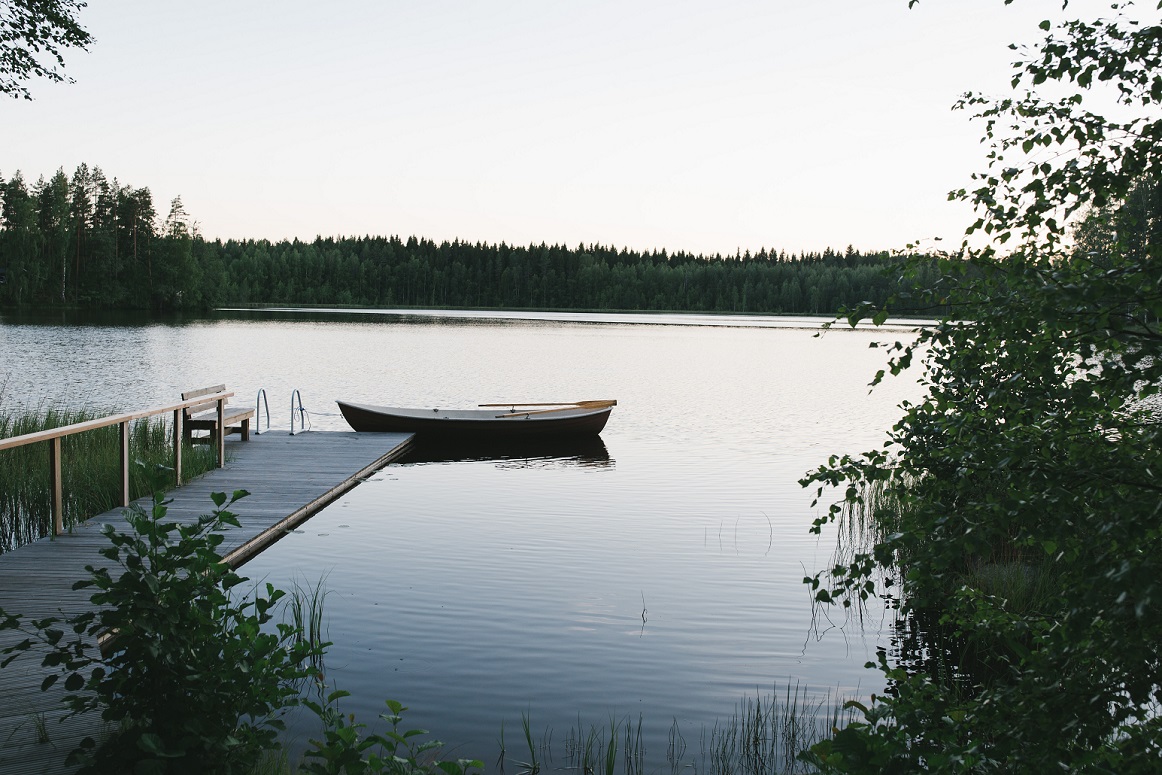 Ansicht eines Sees mit Steganlage und Boot