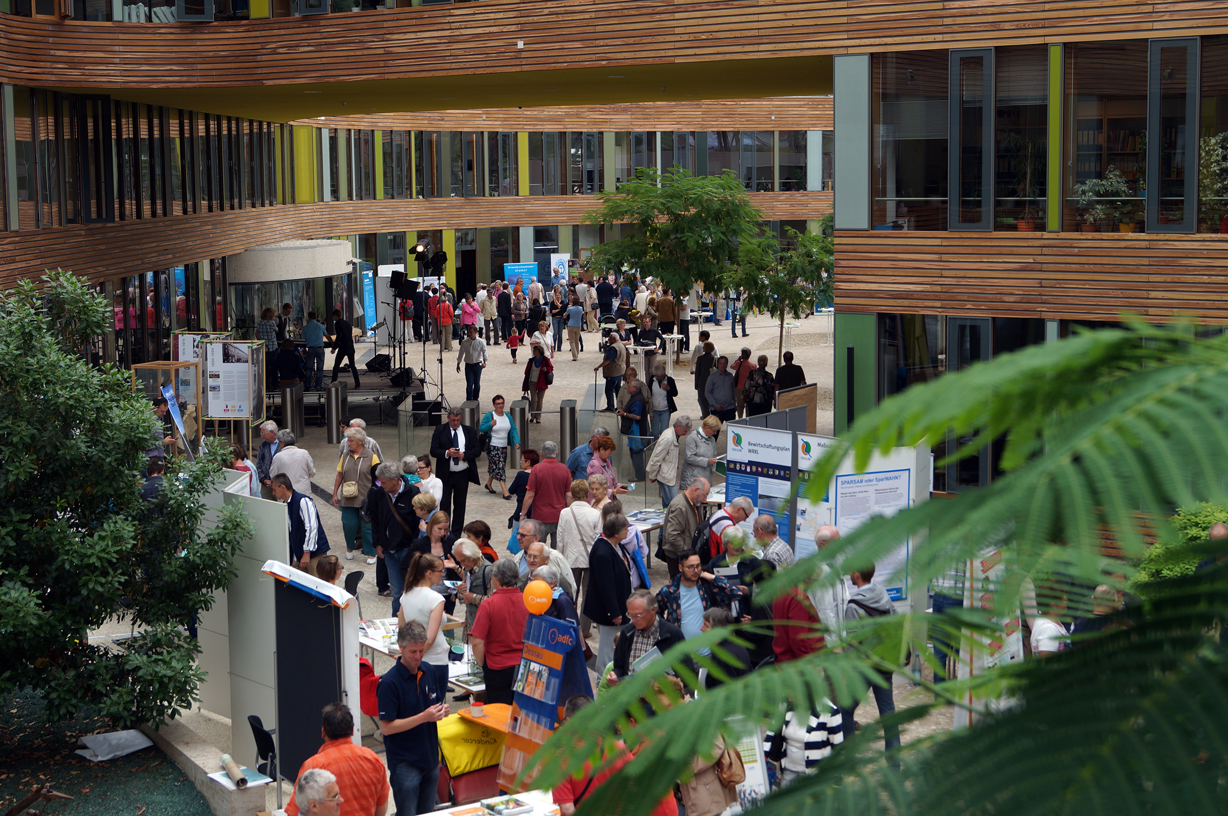 im UBA Dessau-Roßlau informieren sich viele Menschen an Infoständen und Plakaten