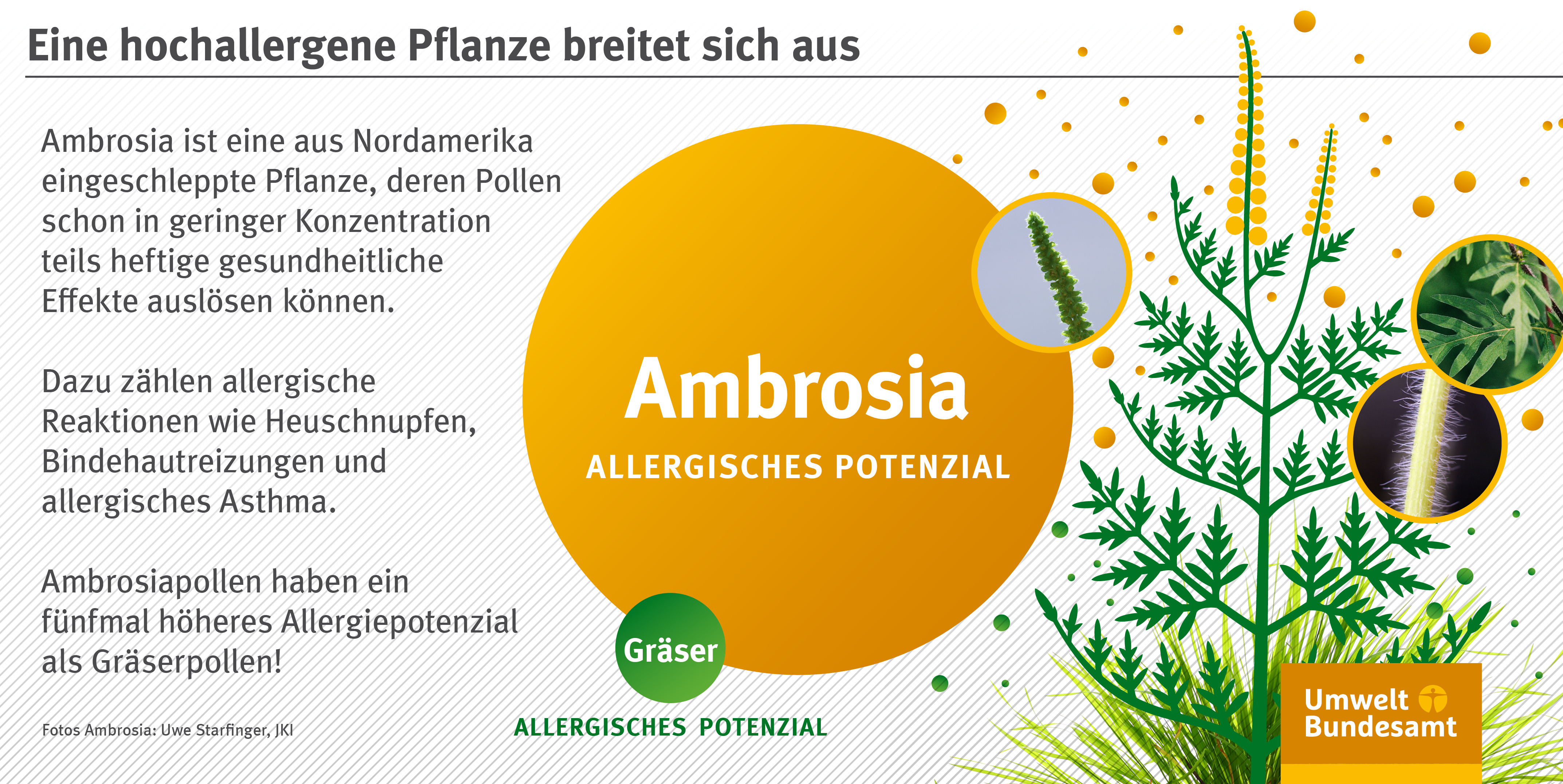 Sie sieht harmlos aus, hat es aber in sich: Die aus Nordamerika stammende Ambrosia breitet sich in Deutschland immer mehr aus. Sie ist nicht nur ein lästiges Ackerunkraut. Ihr Pollen kann schon in kleinen Mengen heftige Gesundheitseffekte beim Menschen auslösen. Dazu zählen allergische Reaktionen wie Heuschnupfen, Bindehautreizungen und allergisches Asthma. Wer bisher schon mit Pollenallergien zu kämpfen hatte, dem kann Ambrosia wegen ihrer langen Blütezeit von Juli bis Oktober noch zusätzlich zu schaffen machen.
