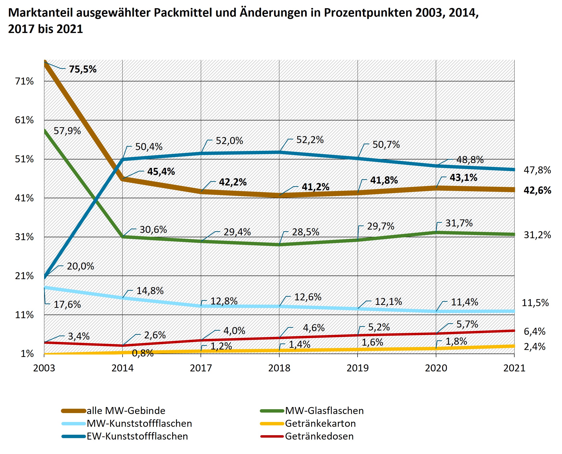 Jährlich wird der Einsatz von Getränkeverpackungen in Deutschland untersucht. Für das Jahr 2021 zeigt eine Studie der Gesellschaft für Verpackungsmarktforschung (GVM) im Auftrag des Umweltbundesamtes einen geringeren Anteil von Mehrweggetränkeverpackungen in den pfandpflichtigen Getränkesegmenten als im Vorjahr. Es wurden 42,6 Prozent der in Deutschland verbrauchten Getränke in Mehrwegverpackungen abgefüllt. Gegenüber dem Jahr 2020 liegt der Wert 0,5 Prozentpunkte niedriger. Weiterhin liegt der Anteil von Mehrweggetränkeverpackungen zumindest über dem Anteil von 41,8 Prozent im Jahr 2019.