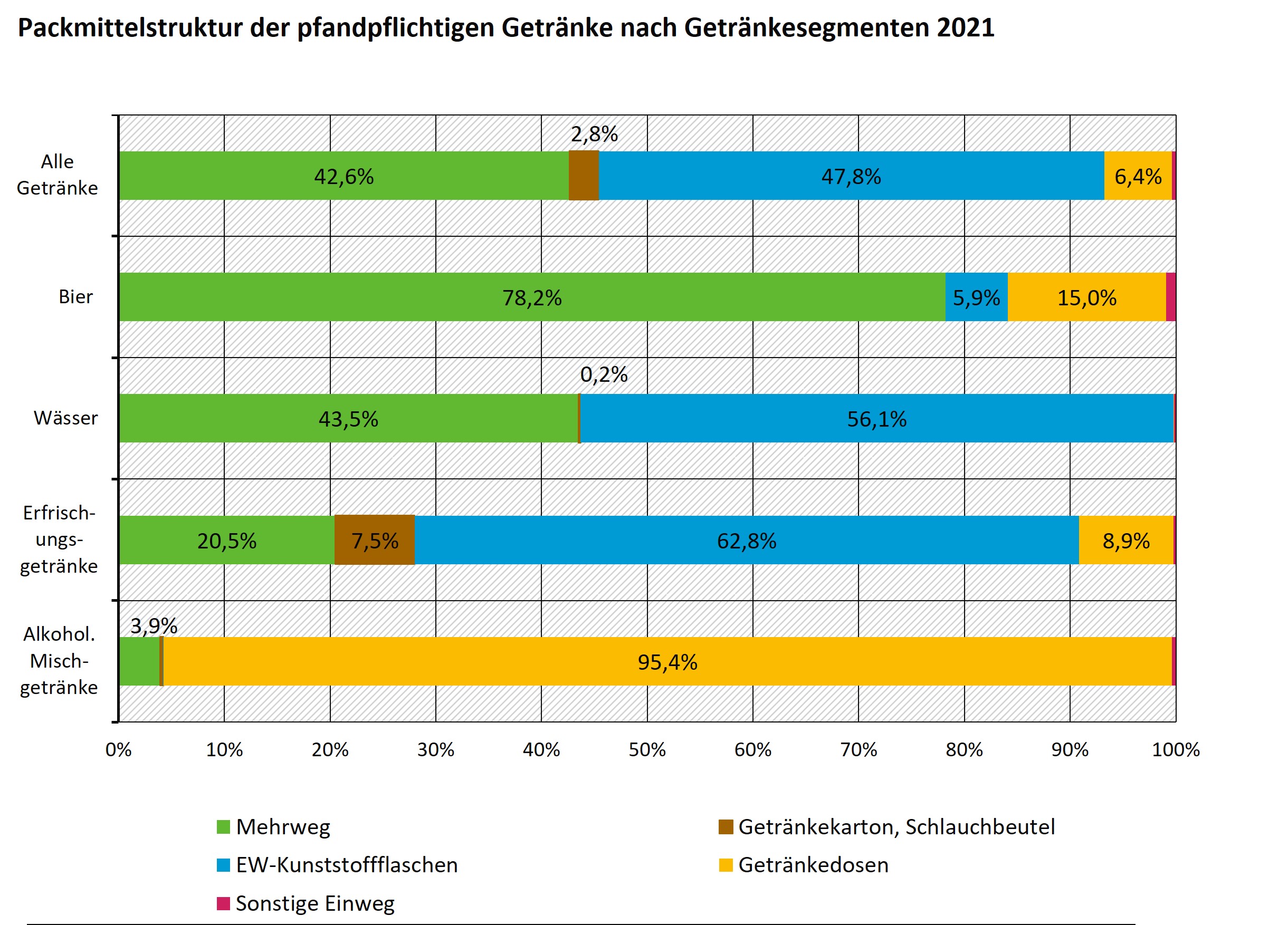Die Mehrwegquote von 42,6 Prozent betrifft die Getränkesegmente, für die durch das Verpackungsgesetz im Jahr 2021 eine Einwegpfandpflicht bestand. Das umfasst Wässer, Bier, Erfrischungsgetränke und alkoholhaltige Mischgetränke. Diese machen etwa drei Viertel des Getränkeverbrauchs aus.