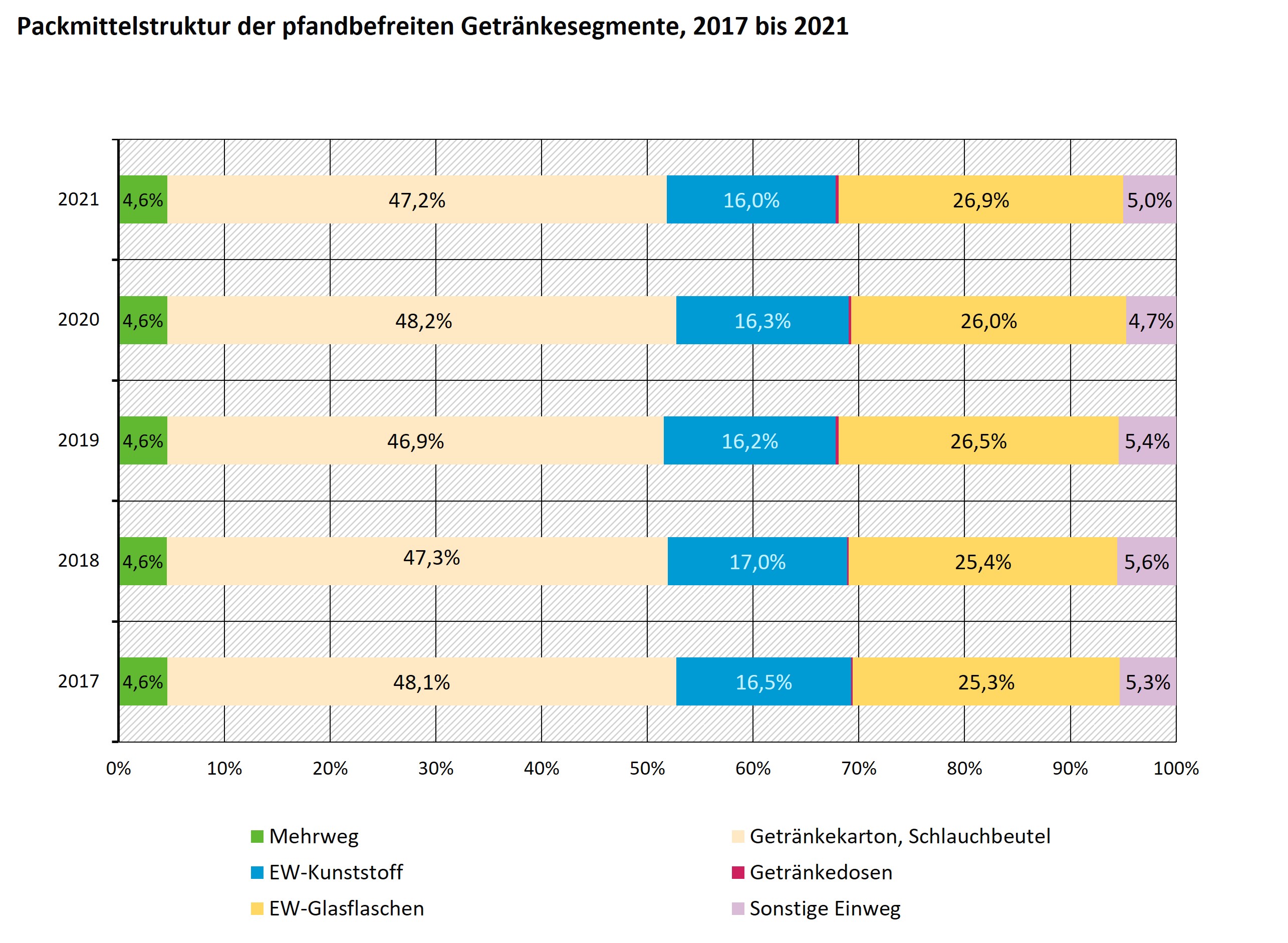 Die nicht pfandpflichtigen Getränke wurden mit 47,2 Prozent hauptsächlich in Getränkekartonverpackungen abgefüllt. Es folgen Einwegglasflaschen mit einem Anteil von 26,9 Prozent und Einwegkunststoffflaschen mit 16,0 Prozent.