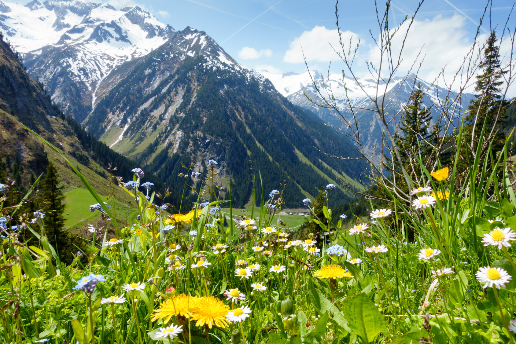 Vorne ist eine Blumenwiese mit Löwenzahn zu sehen, im Hintergrund schneebedeckte Berggipfel.