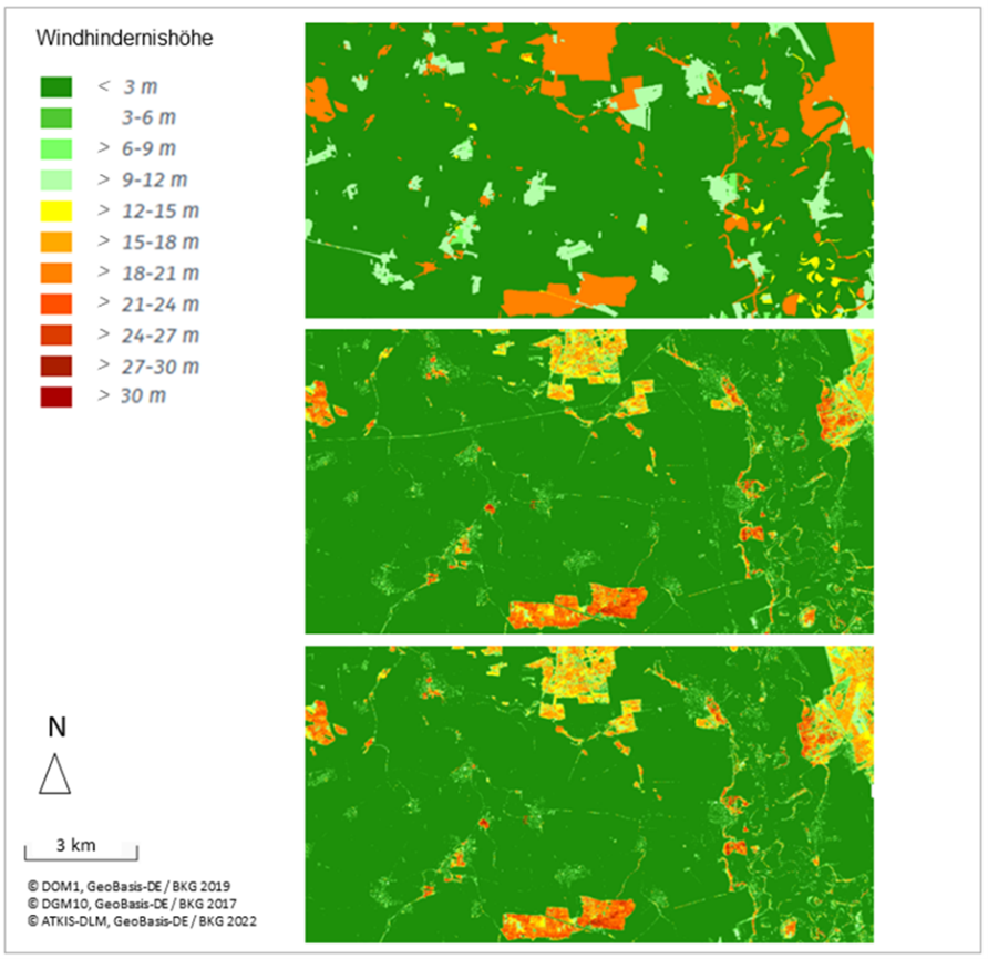 Die natürliche Erosionsgefährdung kann dann für die besonders gefährdeten ackerbaulich genutzten Flächen in einem weiteren Schritt mit den Informationen zu Schutzwirkungsstufen von Windhindernissen wie Baumreihen und Hecken aber auch Bebauung verknüpft werden. Auf Basis von Informationen zur Höhe und Ausrichtung der Hindernisse in Bezug auf die Hauptwindrichtungen wird die Schutzwirkung von Luv und Lee Effekten abgeschätzt (Abbildung 2 und Abbildung 3).