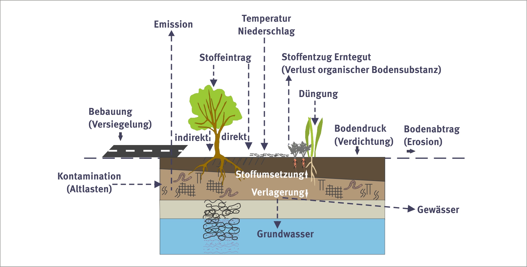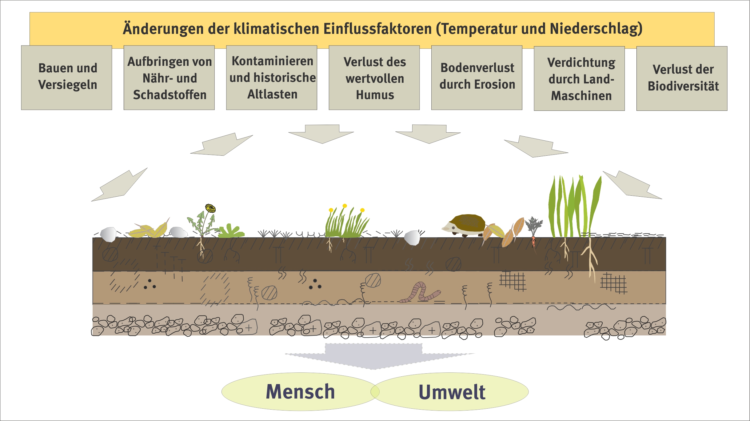 Die historischen und aktuellen Belastungen für den Boden sind zahlreich. Zum einen wird der Boden durch viele unterschiedliche Stoffe belastet, wie toxische Elemente und Verbindungen sowie Nährstoffe. Zum anderen beeinträchtigt vor allem die Bebauung unseren Boden, die immer mit totalem Verlust seiner natürlichen Funktion verbunden ist. Die landwirtschaftliche Nutzung birgt das Risiko von Bodenerosion und Bodenverdichtung. Der Klimawandel und monotone Wirtschaftsweisen verändern den Kohlenstoffgehalt der Böden, der ein wertvoller Garant für die Leistungsfähigkeit der Böden ist.
