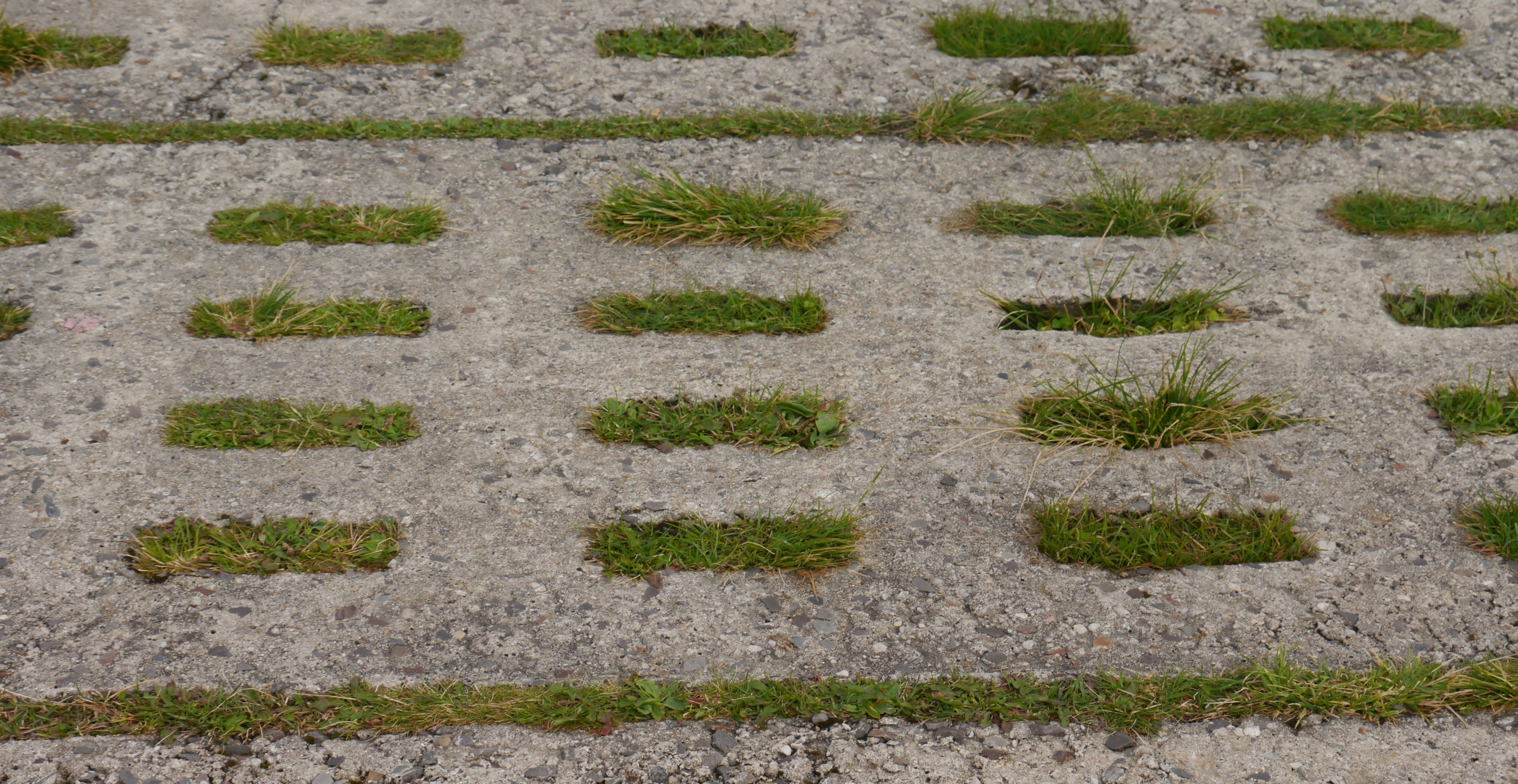 Foto von Betonplatten mit Grasdurchwuchs.