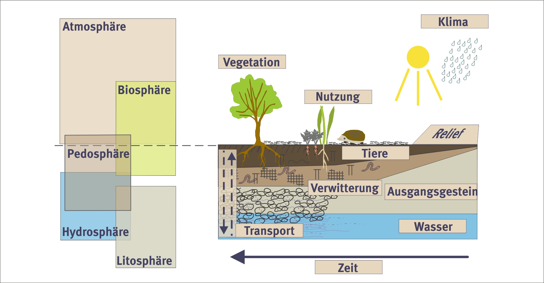 Böden bilden und entwickeln sich über lange Zeiträume, viele Faktoren spielen dabei zusammen. Die wichtigsten natürlichen Einflussfaktoren sind das Gestein, das Klima, Pflanzen und Tiere, die Form und Neigung des Geländes und das Wasserangebot. Von großer Bedeutung sind die Entwicklungszeit und die Intensität der Bodennutzung durch den Menschen, welche in den letzten Jahrhunderten zu erheblichen Bodenveränderungen geführt hat.
