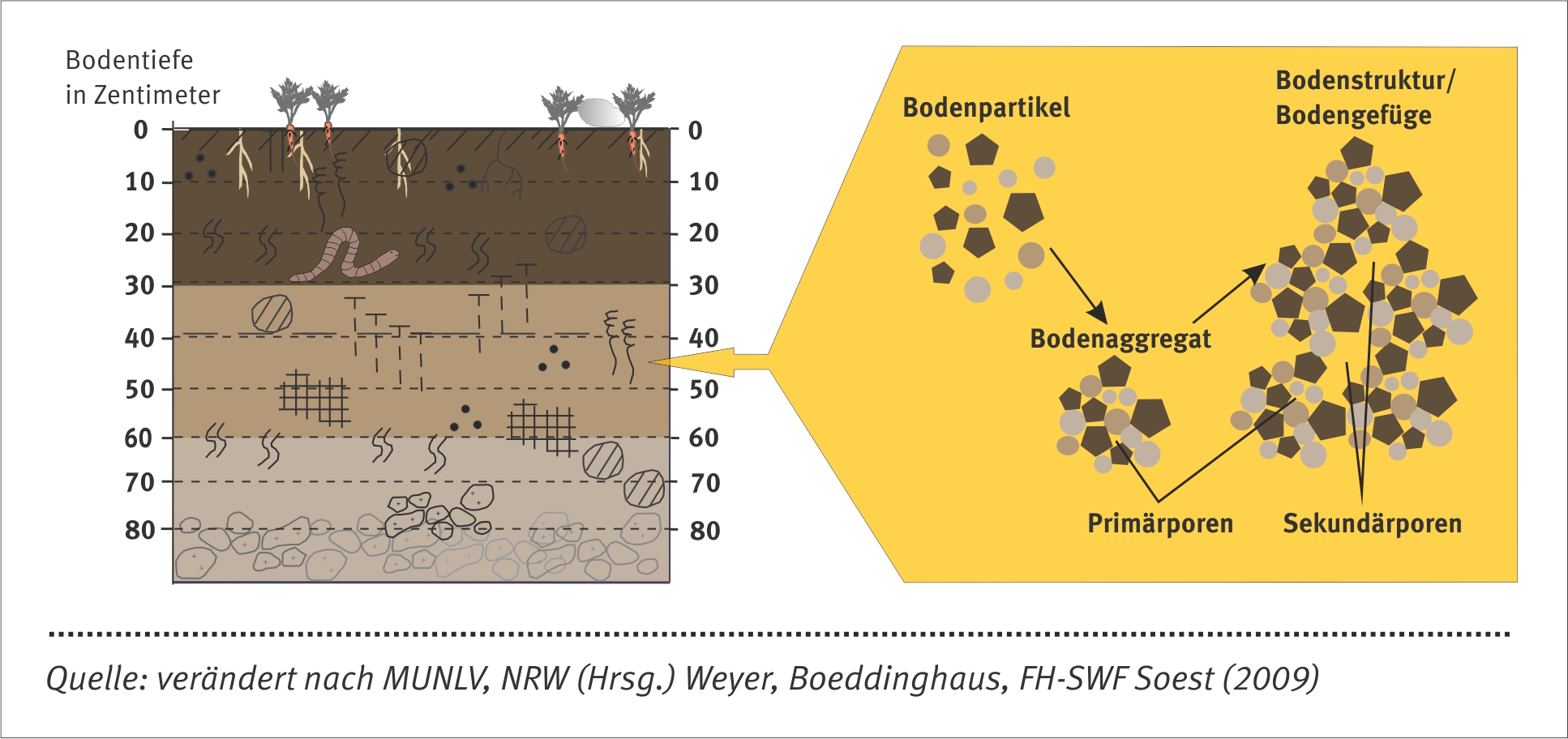 Alle genannten Vorgänge beeinflussen die Zusammensetzung und die Eigenschaften des Bodens und geben ihm ein charakteristisches Aussehen in Form des vertikalen Profilaufbaus mit seinen Schichten und Horizonten.