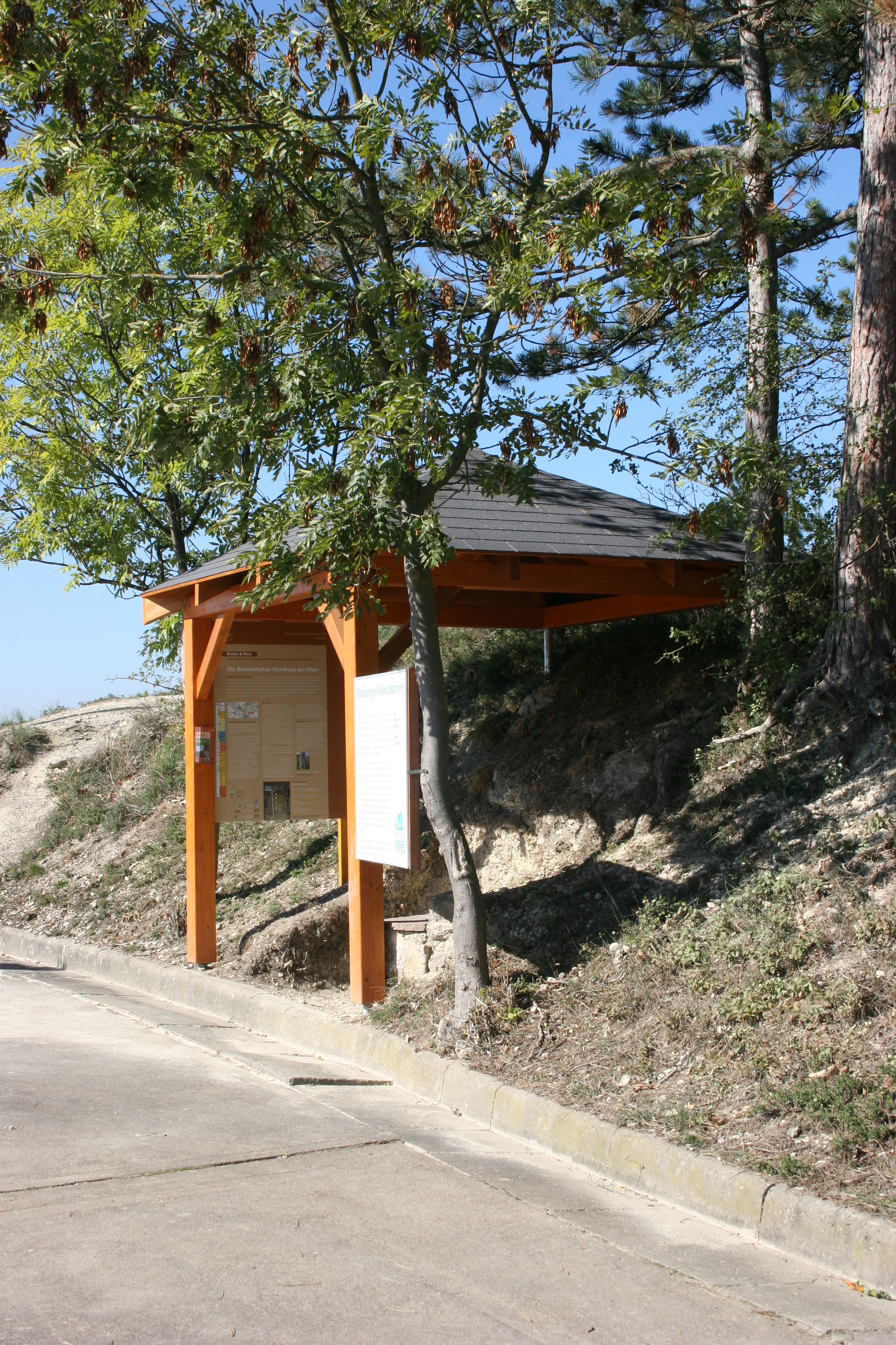 Ein Hinweisschild in Homburg, kurz vor Ortsende, zeigt zu dieser Bodenstation, die gut zugänglich an einem barrierefreien Weinwanderweg (Wegmarkierung Winzermännle), zwischen dem Naturschutzgebiet und dem Weinort Homburg am Main, liegt. Sie beschreibt die Besonderheiten des Bodens: eine Rendzina aus schluffiger Verwitterung des Unteren Muschelkalks (Wellenkalk).