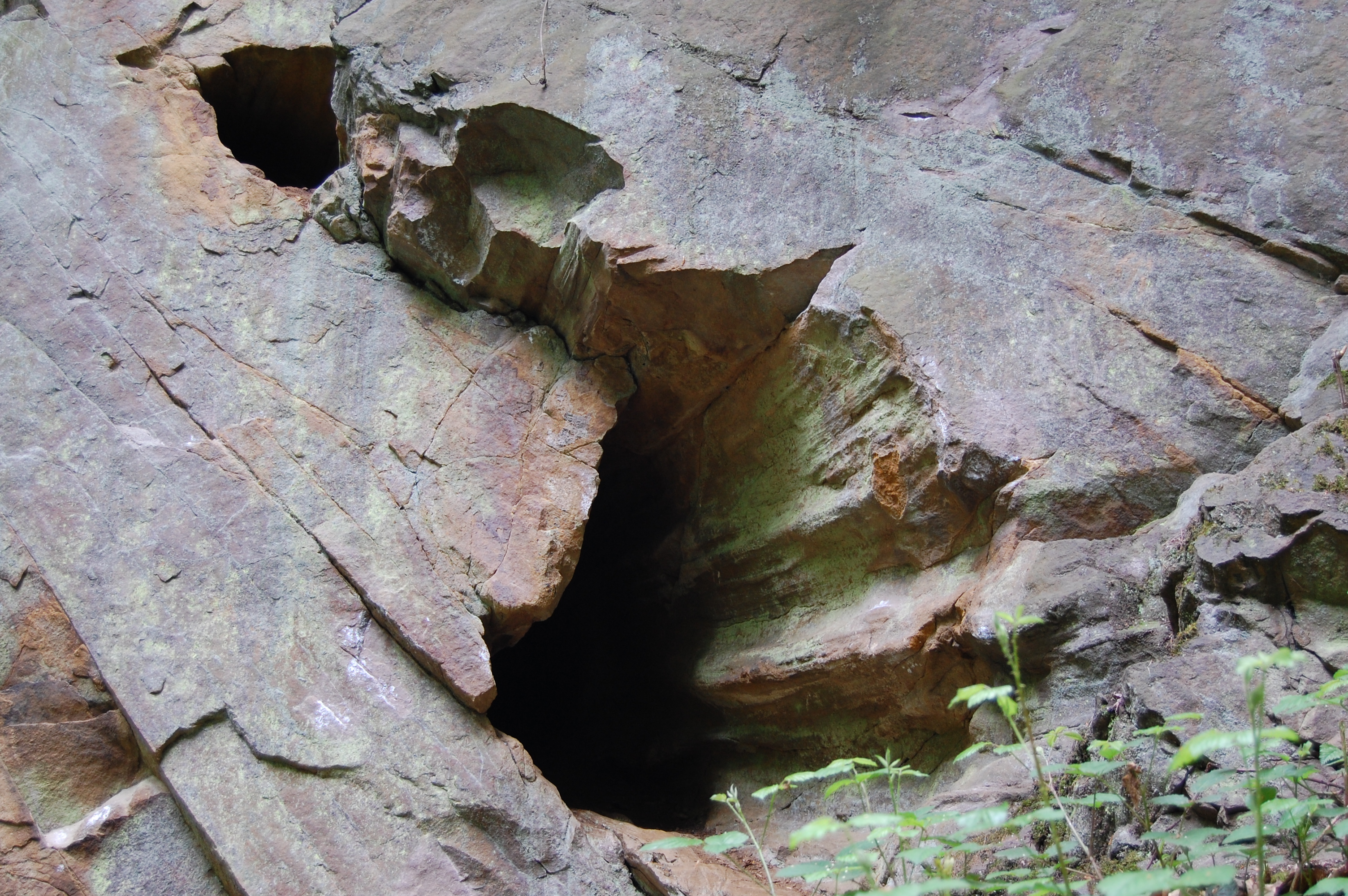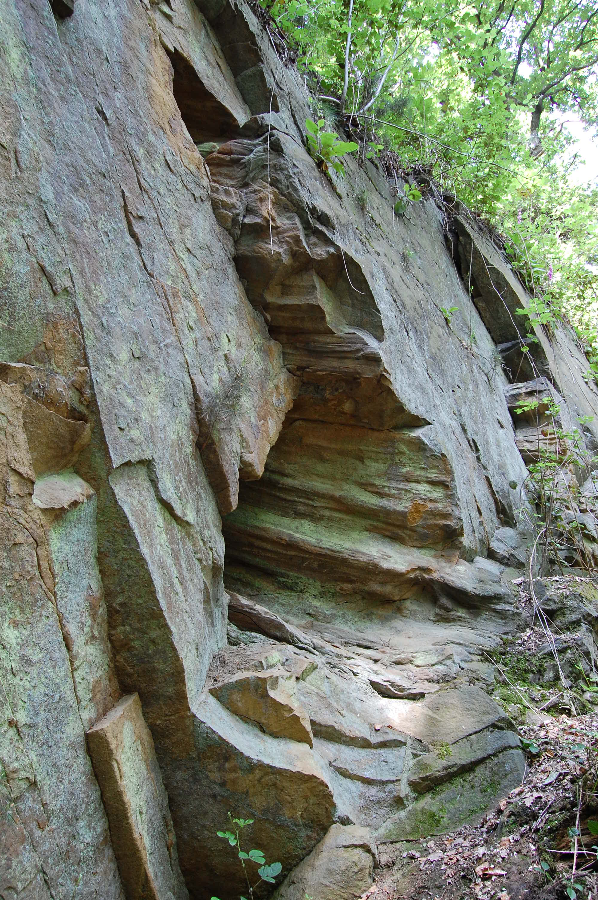 In einer 15 m hohen Sandsteinwand sind Abdrücke von fossilen Bäumen aus der Karbonzeit zu erkennen. Sie stammen von Bäumen, die keine feste Holzsubstanz besaßen und vermutlich in ihrem Inneren hohl waren. Flüsse lagerten Sande in den damals tropischen Wäldern ab und überdeckten die abgestorbenen Bäume. Im Laufe der Zeit kam es zu weiteren Überlagerungen, wodurch sich der Druck auf die Sande und die Baumstämme verstärkte. Dadurch entstand Sandstein und in diesem Fall die Abdrücke der beiden Urzeit-Bäume.