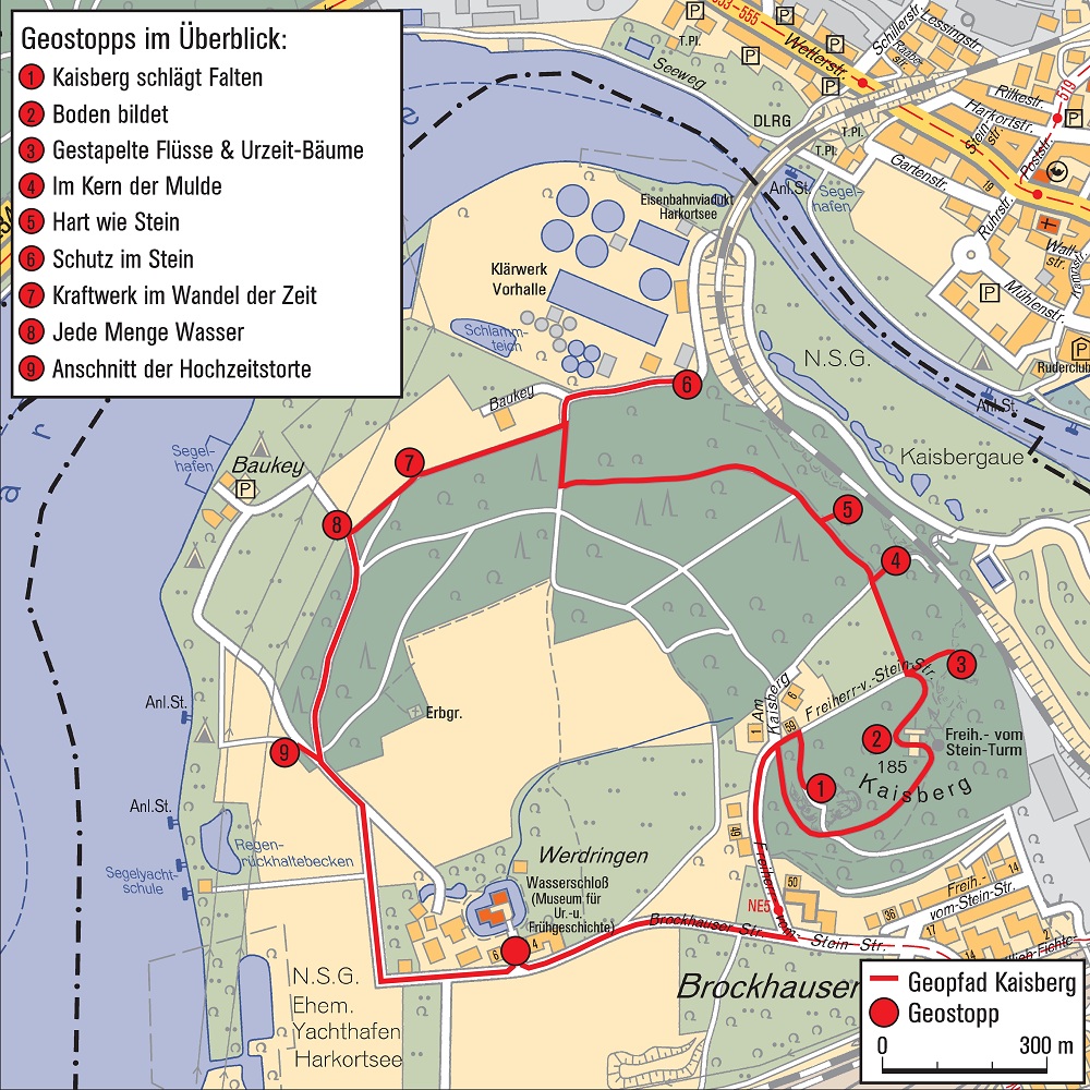 Der Geopfad lädt als Teiletappe der GeoRoute Ruhr (Schwerte – Mülheim) zu einer Wanderung über den Kaisberg in Hagen-Vorhalle ein. Start- und Zielpunkt des 5,5 km langen Rundweges ist das Wasserschloss Werdringen. Der Pfad verläuft entlang ausgeschilderter Wanderwege und führt Besucher durch einen 170 Jahre alten Buchenwald mit nährstoffarmen Braunerdeboden. Neun leicht verständliche Tafeln informieren über die Geologie der Region sowie das hier angesiedelte Kraftwerk. Auch die Bildung und der Aufbau von Braunerde sowie ihre Bedeutung als Pflanzenstandort werden thematisiert.