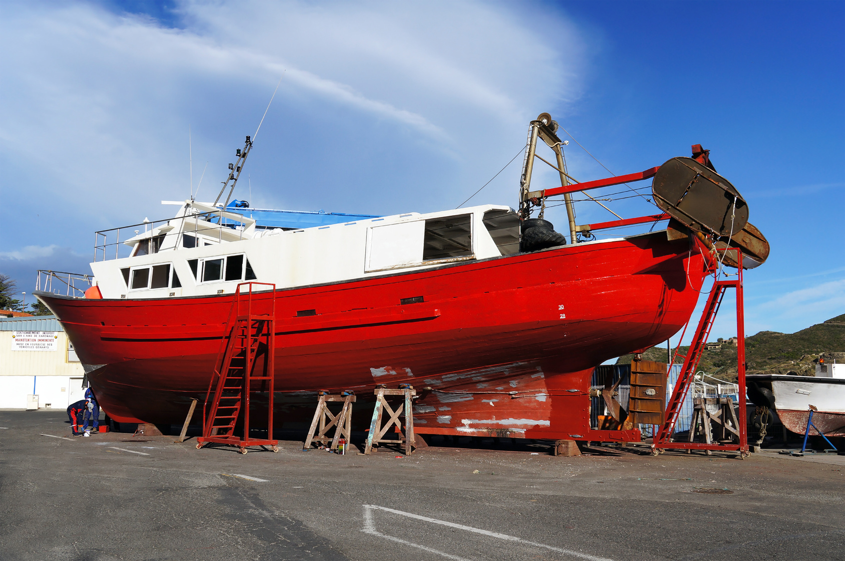 rotes Fischerboot liegt in der Werft, wird neu angestrichen
