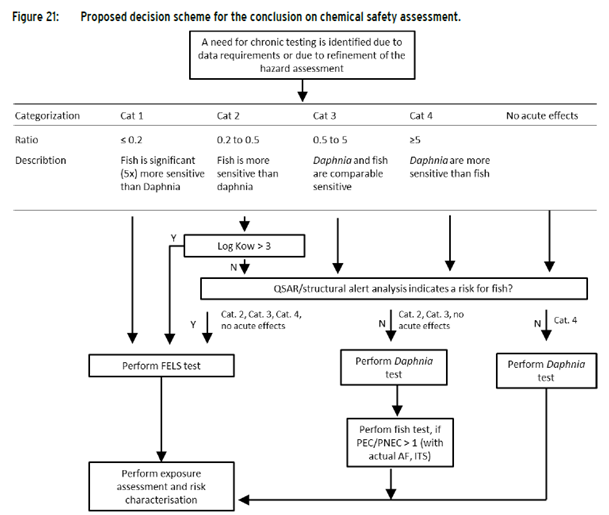 Ziel des englischsprachigen Gutachtens „Comparison of species sensitivity of Daphnia and fish in acute and chronic testing” war, diese ITS zu prüfen und weiter auszugestalten. Dazu wurde eine große Anzahl von Stoffen durch Analyse von akuten und chronischen Ökotoxizitätsdaten aus Datenbanken untersucht. Anhand von Toxizitätswerten von Fischen und Daphnien wurde geprüft, unter welchen Bedingungen eine sichere Chemikalienbewertung auch ohne experimentelle Ergebnisse zur Toxizität bei Fischen nach längerfristiger Exposition möglich ist. Im Ergebnis stellt die Studie ein neues Entscheidungsschema zur Verfügung: