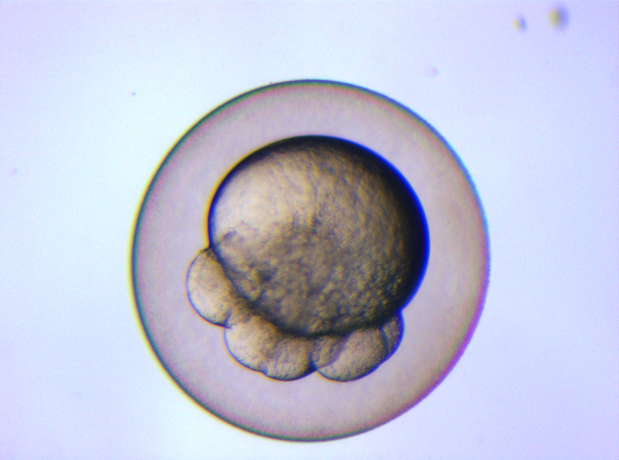 Ein rundes Fischei nach der Befruchtung. Es zeigt sich ein rundes Gebilde und angrenzende runde Formen. Fischembryo kurz nach der Befruchtung