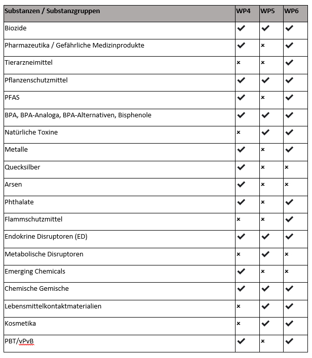 Das UBA ist insgesamt in acht von neun Arbeitspaketen (WP) mit insgesamt 36 Mitarbeitenden vertreten. Zusätzlich hat das UBA die Leitung des WP 4 („Monitoring und Exposition“) übernommen und das BfR als zweite vertragszeichnende Institution in Deutschland u.a. die Leitung des WP 5 („Hazard Assessment“). In dem WP 4 sollen die Exposition des Menschen und der Umwelt gegenüber Chemikalien gemeinsam betrachtet werden. (Liebmann et al, 2024)4 Die Untersuchungen stehen unter dem Fokus des „one-substance-one-assessment approach“ (van Dijk et al, 2021)3 mit dem Ziel die Verknüpfung der Daten zwischen Gesundheit und Umwelt zu stärken und eine integrierte Bewertung zu ermöglichen. Außerdem werden in PARC neue Methoden entwickelt und getestet, die unter anderem darauf abzielen, eine verbesserte Expositionsabschätzung von besonders vulnerablen Bevölkerungsgruppen zu erreichen. Schwerpunkt der WP 4 Methodenentwicklung sind sogenannte „Screening-Methoden“, die es ermöglichen sollen, für eine große Anzahl an Chemikalien gleichzeitig deren Präsenz in der Umwelt und im Menschen zu bestimmen. Dazu sollen bestehende Monitoringprogramme weiterentwickelt werden und die Monitoringergebnisse in Zukunft systematisch in der Zulassung gefährlicher Stoffe verwendet werden.